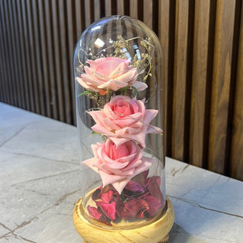 Kupolë qelqi me këmbë druri dhe 3 boce trëndafila
