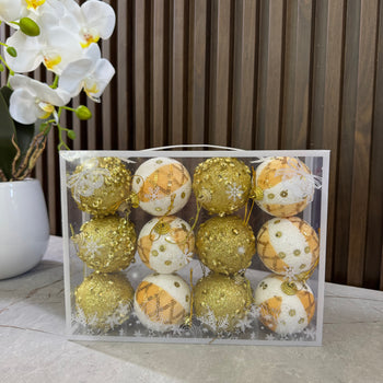 Tavolina ka formë moderne me dy kone të bardha të bashkuara në mes nga një sferë metalike ngjyrë ari, duke krijuar një dizajn elegant dhe simetrik.