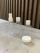Set me shishe plastike për udhëtim me 6 pjesë; një shishe sapuni, një me spurcim, 2 shishe për likuid dhe 2 kontenitorë për krem
