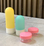 Set me 4 pjesë shishe udhetimi; Seti përfshin 2 shishe bosh silikoni dhe 2 kontenitorë kremrash me ngjyra ngjyra