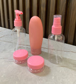 Set me 5 pjesë rozë me shishe udhetimi që përfshin shishe sapuni, një shishe për likuid silikoni, nje shishe me spurcim dhe 2 kontenitorë për krem