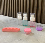 Set me shishe plastike për udhëtim me 6 pjesë; një shishe sapuni, një me spurcim, 2 shishe për likuid dhe 2 kontenitorë për krem