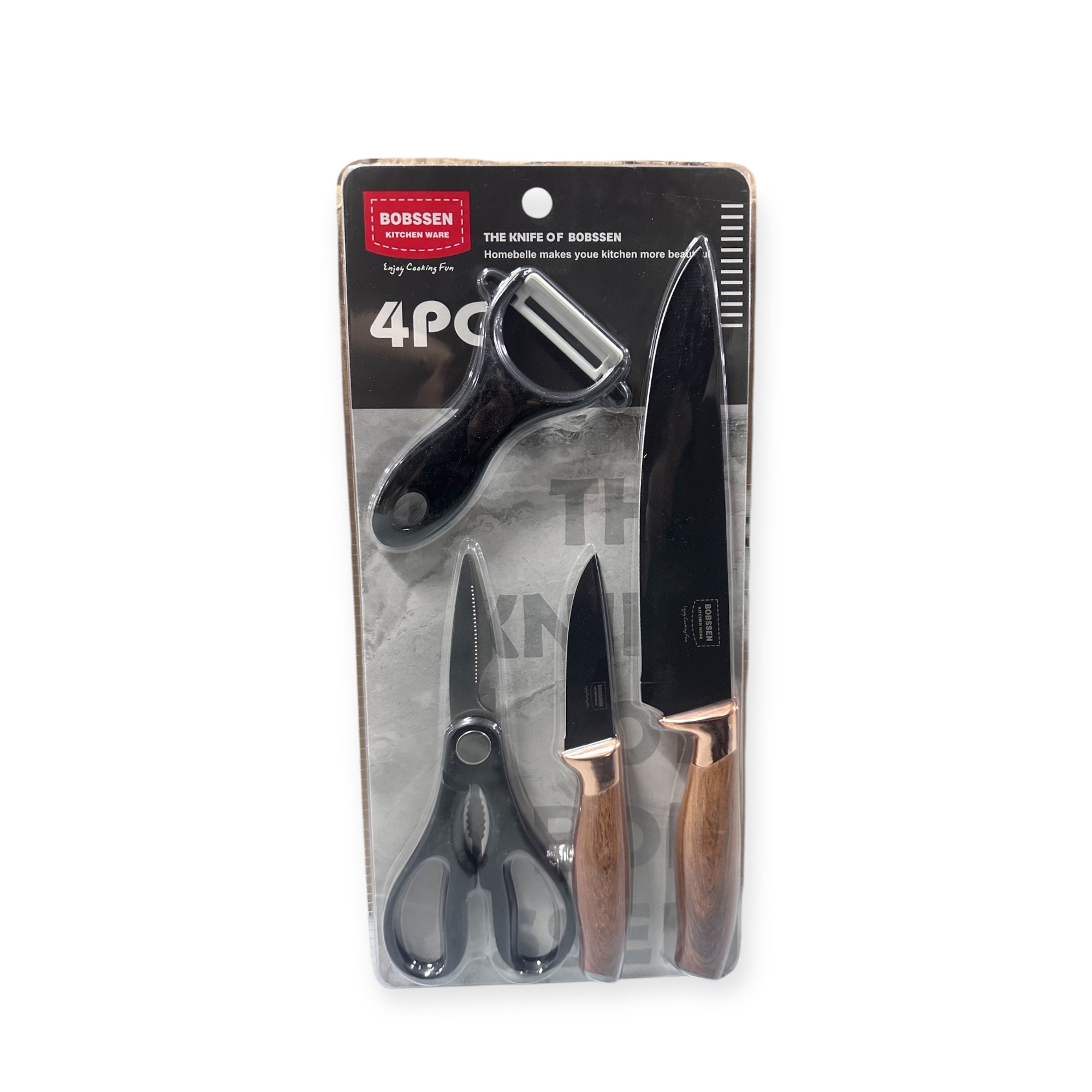 Set me qëruese perimesh, gërshërë, 2 thika me madhësi të ndryshme; Materiali: PP dhe Stainless Steel; Thikat janë me detaje gold dhe bisht druri