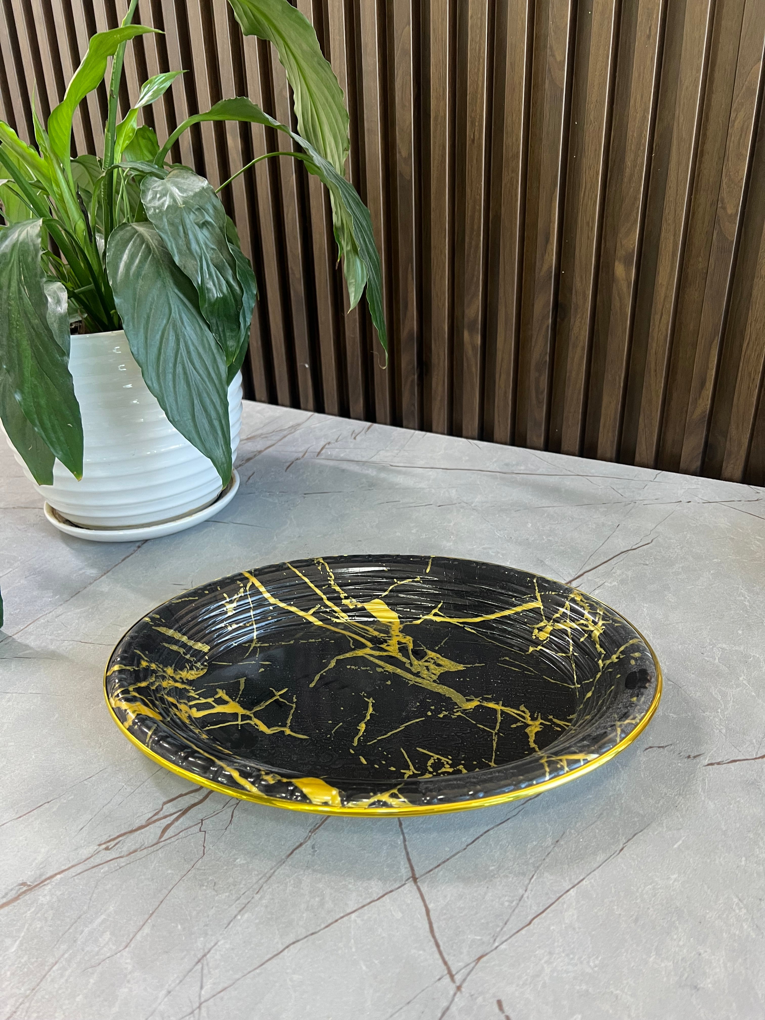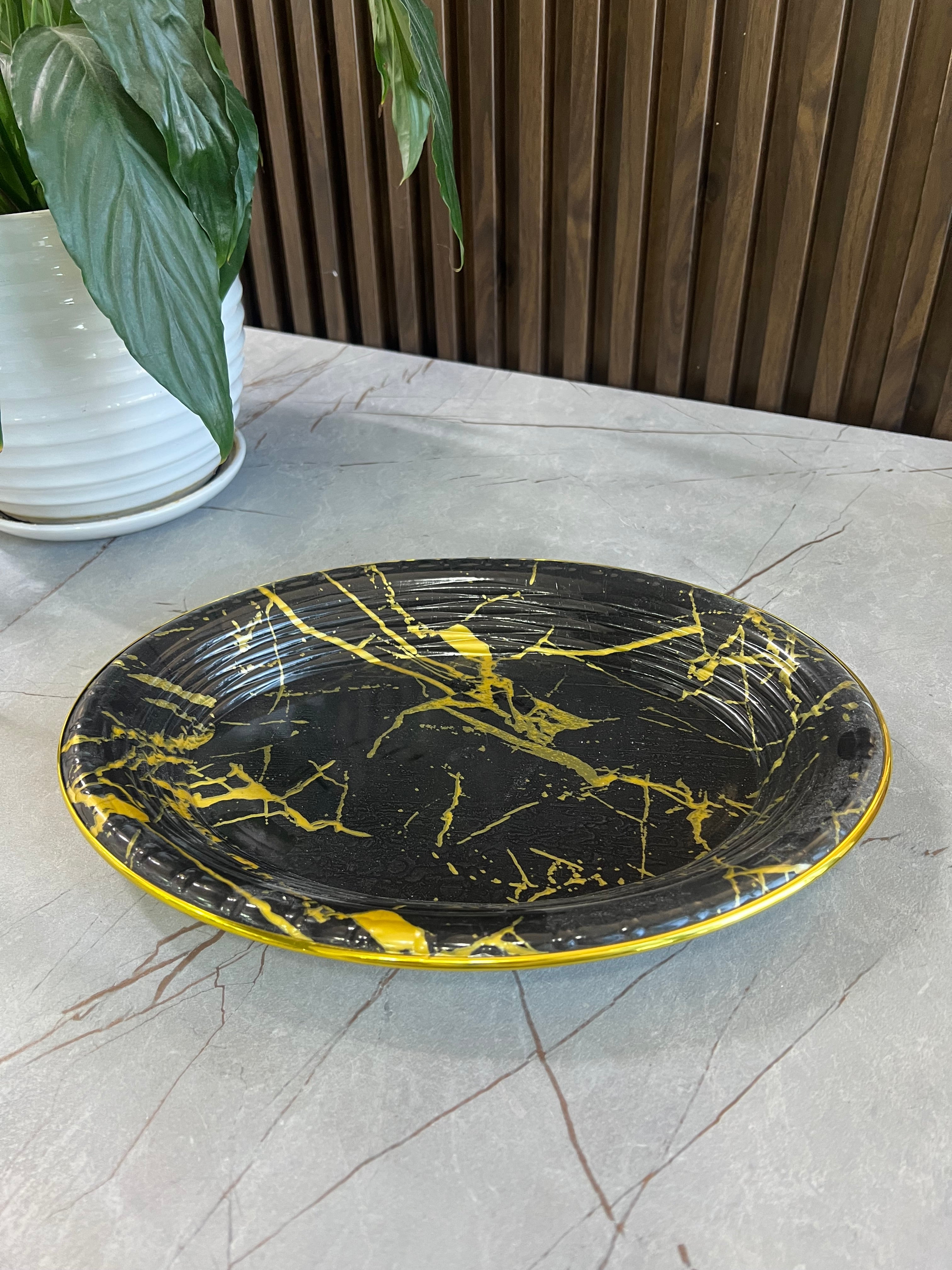 Tabaka servirjeje rrethore me efekt mermeri, në ngjyrë të zezë me detaje gold
