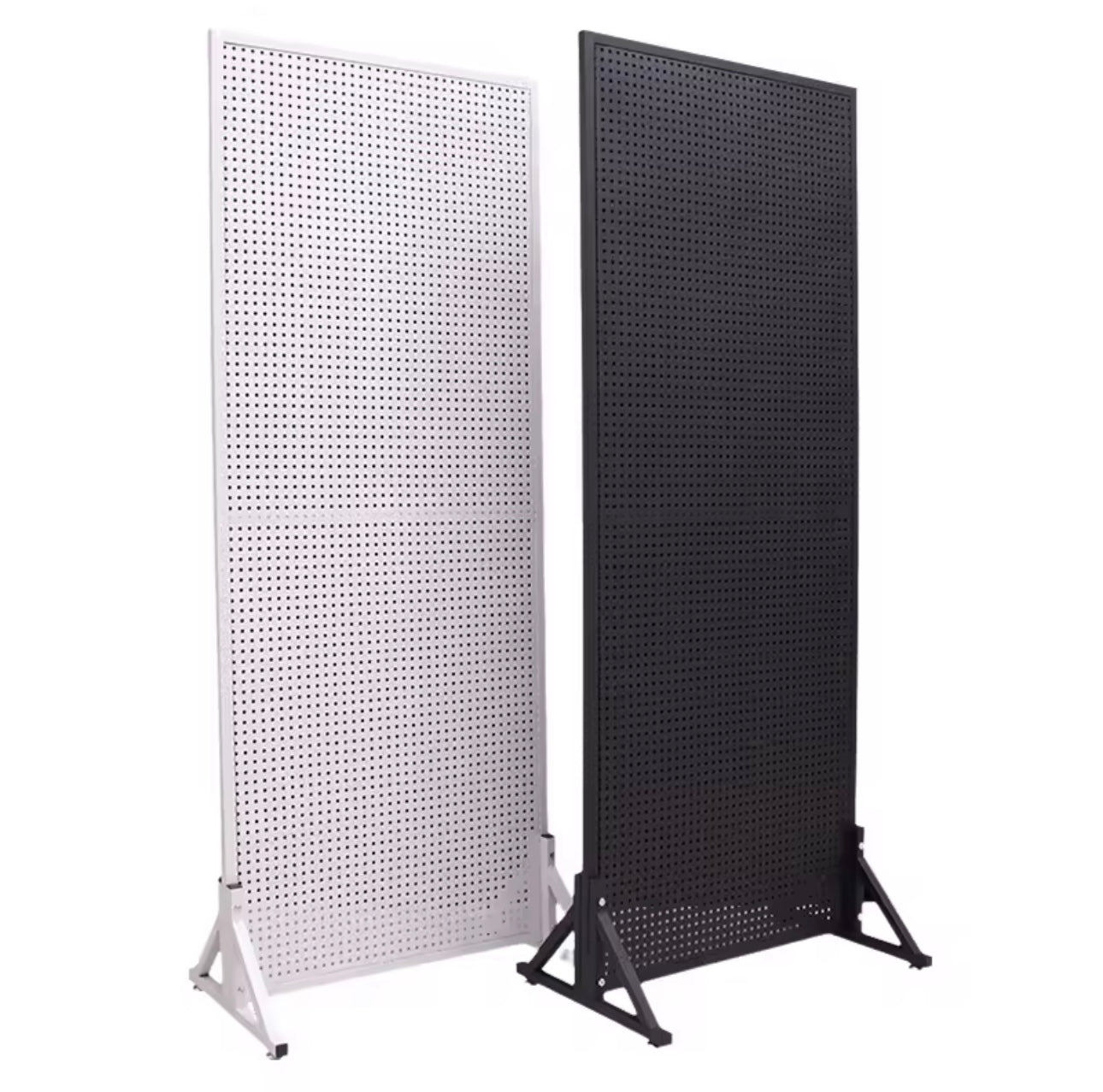 Panel ekspozimi metalik me vrima, praktik për varjen dhe organizimin e aksesorëve, i përshtatshëm për dyqan, showroom ose ekspozim produktesh.