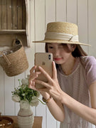 Kapele plazhi kashte me fjongo të bardhë në ngjyrën bezhë dhe pana✨