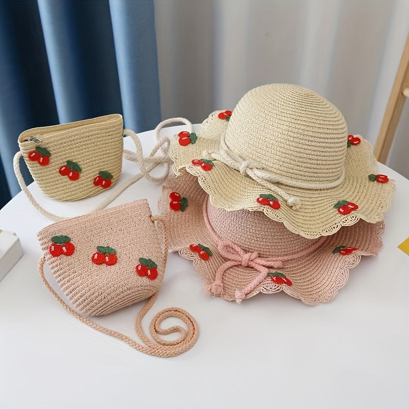 Set me kapele kashte dhe çantë për fëmijë me qershi