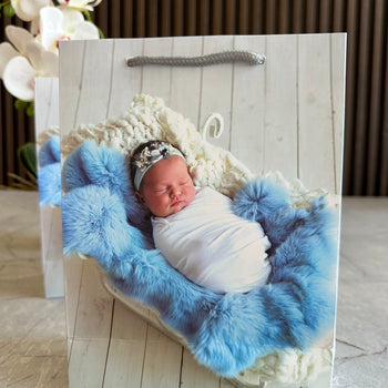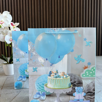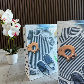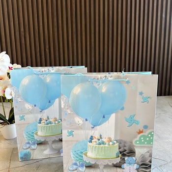 Çantë paketimi transparente "Boy" me karrocë bebesh, dhurata dhe tullumbace