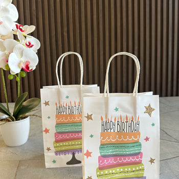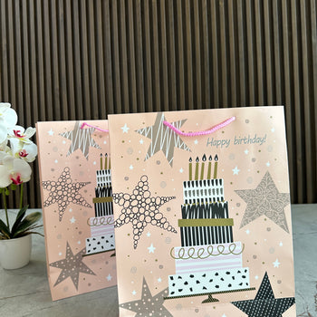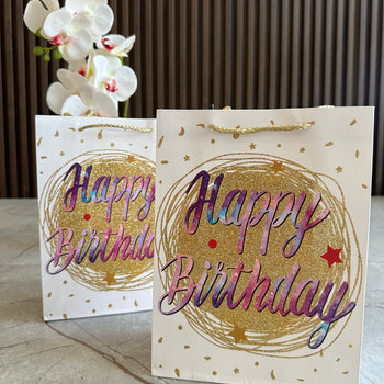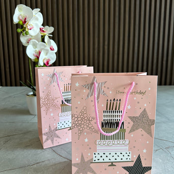 Çantë paketimi transparente "Happy birthday" me qirinj dhe yje