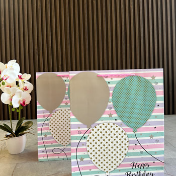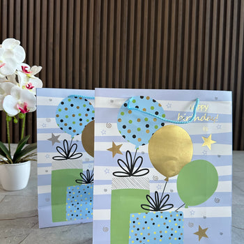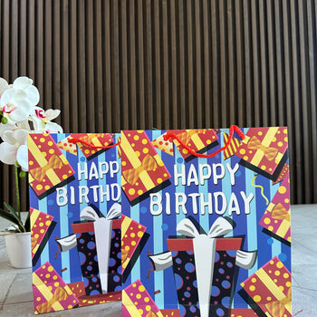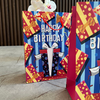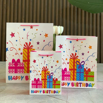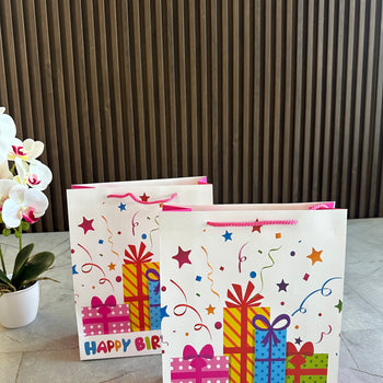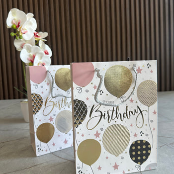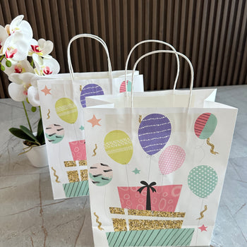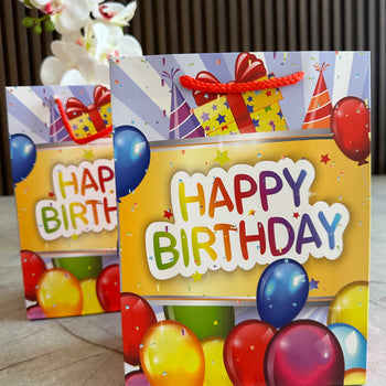 Çantë paketimi transparente "Happy birthday" me dhurata, tortë dhe tullumbace