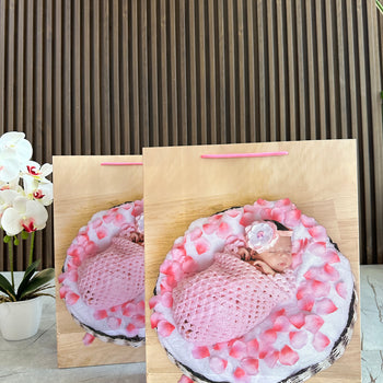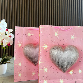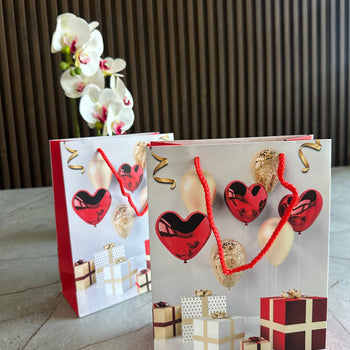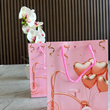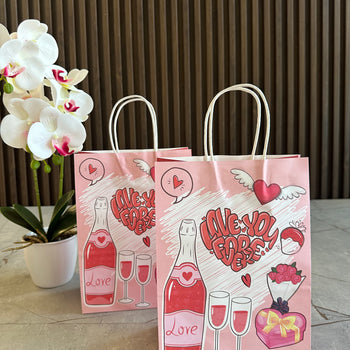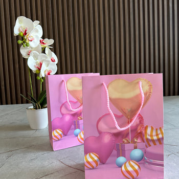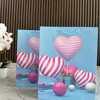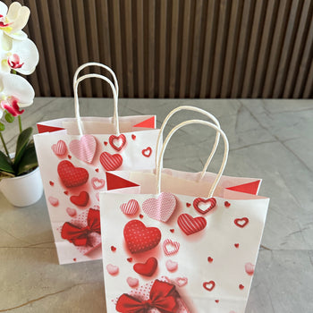 Çantë kartoni me figura zemrash e tortash dhe shkrim “Love”
