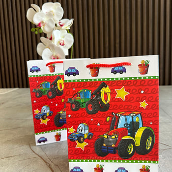 Çantë kartoni me figura makinash dhe shkrim “Love”