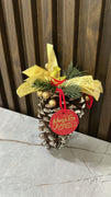 Strobull dekorativ me drerë të artë – Ornament festiv i zbukuruar me fjongo të artë, degëza jeshile, toptha dekorativë dhe figurë dreri. I pajisur me etiketë “Merry Christmas”, ideal për pemë, derë apo dekorim shtëpie.
