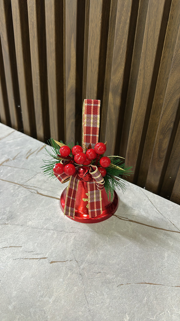 Zile dekorative festive në ngjyrë të kuqe, e zbukuruar me kokrra të kuqe, degëza jeshile dhe fjongo me dizajn kuadratesh. E përshtatshme për zbukurimin e pemës, derës apo ambienteve të ndryshme gjatë festave.