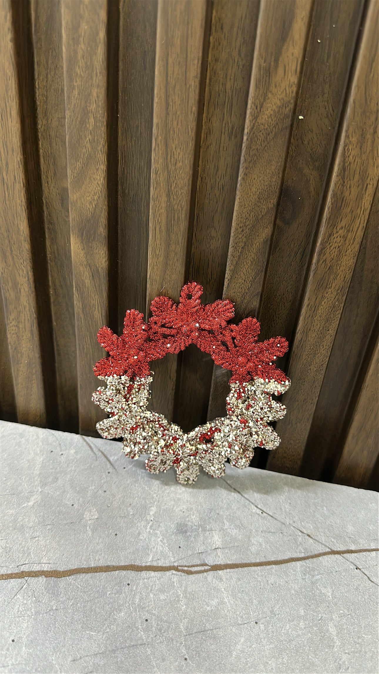 Kurorë dekorative me shkëlqim – Ornament festiv në formë kurore, me ngjyra të kuqe dhe ari. E përshtatshme për zbukurimin e pemës, derës apo ambienteve të brendshme, duke sjellë një prekje elegante dhe festive.