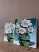 Pikturë me vazo blu dhe lule të bardha me gura zbukurues; Materiali: PVC; 5 Përmasa: 30 cm x 30 cm Kodi: PVC-1; 40 cm x 40 cm Kodi: PVC-2; 50...