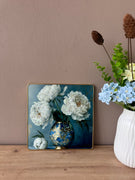 Pikturë me vazo blu dhe lule të bardha me gura zbukurues me kanavacë