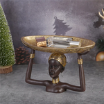 Statujë me 2 drerë dekorativ ngjyrë të zezë, njeri i ulur dhe tjetri në këmbë me pjatë gold sipër me diametër 31 cm, 21 cm