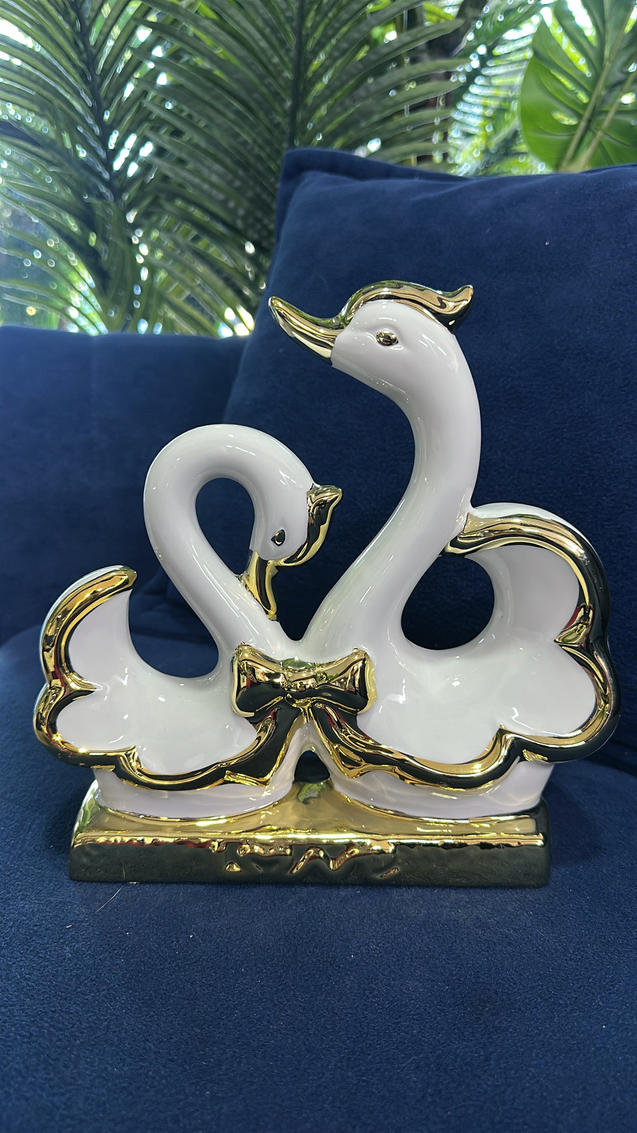 Skulpturë dekorative me dy mjellma elegante në ngjyrë të bardhë me detaje gold. E punuar me finesë dhe shkëlqim të lartë, simbolizon dashurinë dhe harmoninë. Përshtatet në mënyrë të përkryer për zbukurimin e dhomës së ndenjjes, komodinë apo si dhuratë elegante për raste të veçanta.