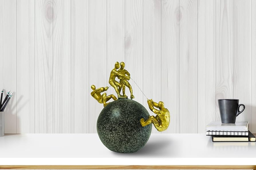 Statujë dekorative me njerëz gold sipër një sfere me tërheqjen e një teli me përmasë 29 cm x 26.5 cm