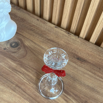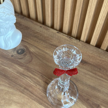 Shandan qelqi trasparent për qiri me fjongo të kuqe