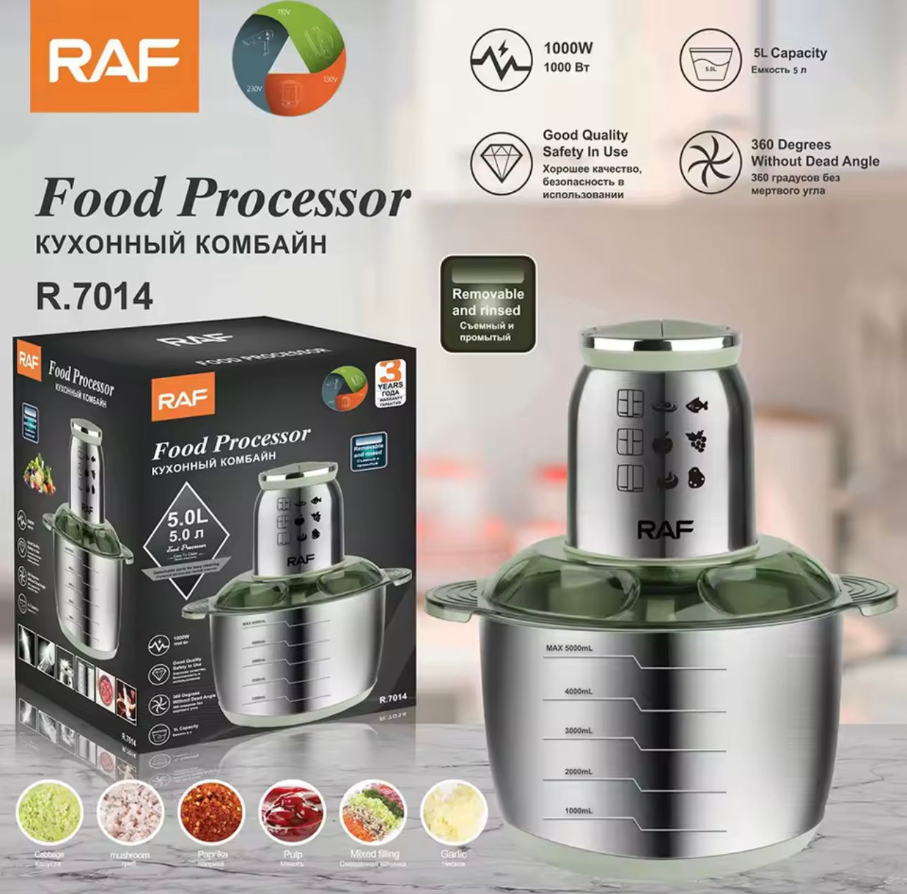 Grirëse profesionale RAF me kapacitet 5 litra dhe motor 1000W, ideale për mish, perime, qepë, fruta, hudhra dhe përzierje të ndryshme. Materiali: Inox. Thika të mprehta. Praktike e fuqishme. Ideale...