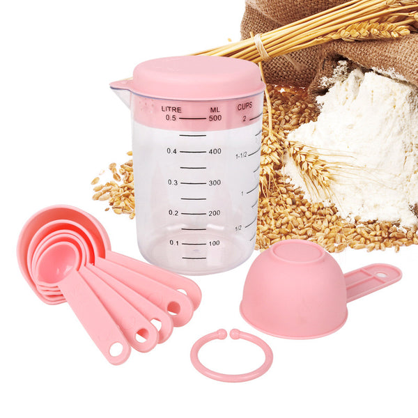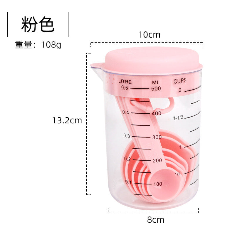 Enë dhe set me 5 lugë matëse; Kana ka kapacitet 500 ml; Lugët: 2.5 ML, 5 ML, 7.5 ML; 15 ML, 60 ML, 80 ML; Njësi matjetje edhe me Cups; Mteriali : Plastike; Ngjyrat: Rozë, e bardhë, blu