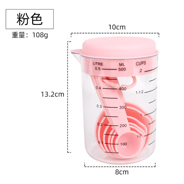 Enë dhe set me 5 lugë matëse; Kana ka kapacitet 500 ml; Lugët: 2.5 ML, 5 ML, 7.5 ML; 15 ML, 60 ML, 80 ML; Njësi matjetje edhe me Cups;...