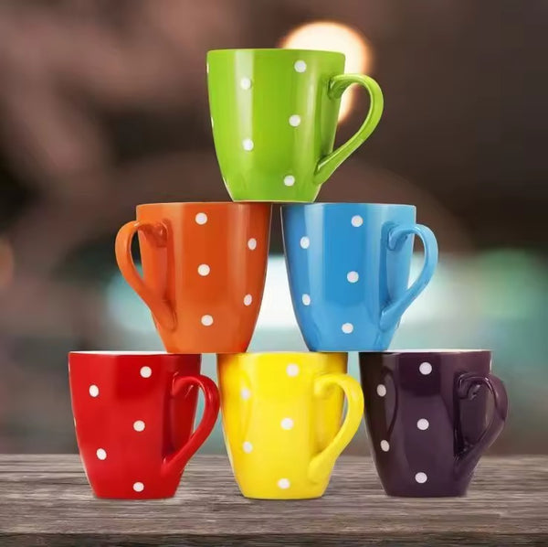 Filxhan çaji prej qeramike me pika dhe ngjyra; Ngjyrat: Portokalli, jeshile, blu; Gjatësi 11 cm