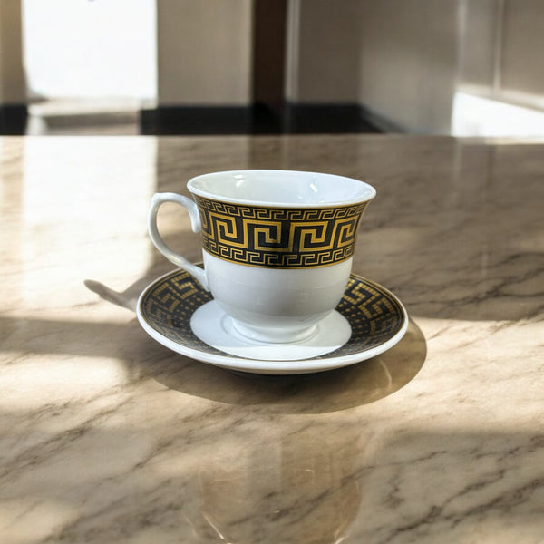 Set me filxhana çaji me motive Versace të zezë me gold dhe rombe; Paketim me kuti 6 copë; Përmasat: 7 cm x 9 cm; Materiali: Porcelani