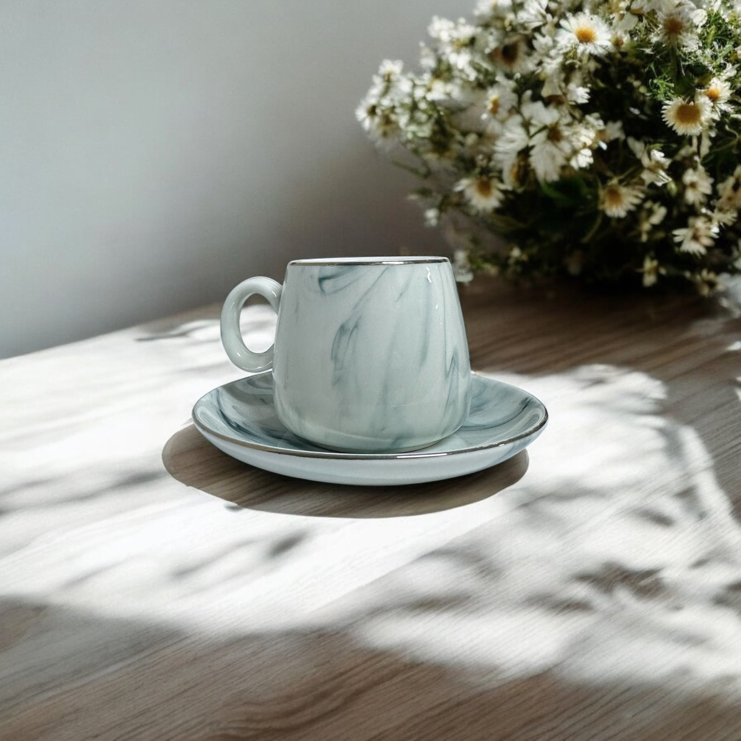 Set me filxhana kafeje, dizenjo mermeri me ngjyra; Materiali: Qeramike; Ngjyrat: Blu, rozë; Me kontur gold; Gjatësi filxhani 6cm, pjatë 11 cm