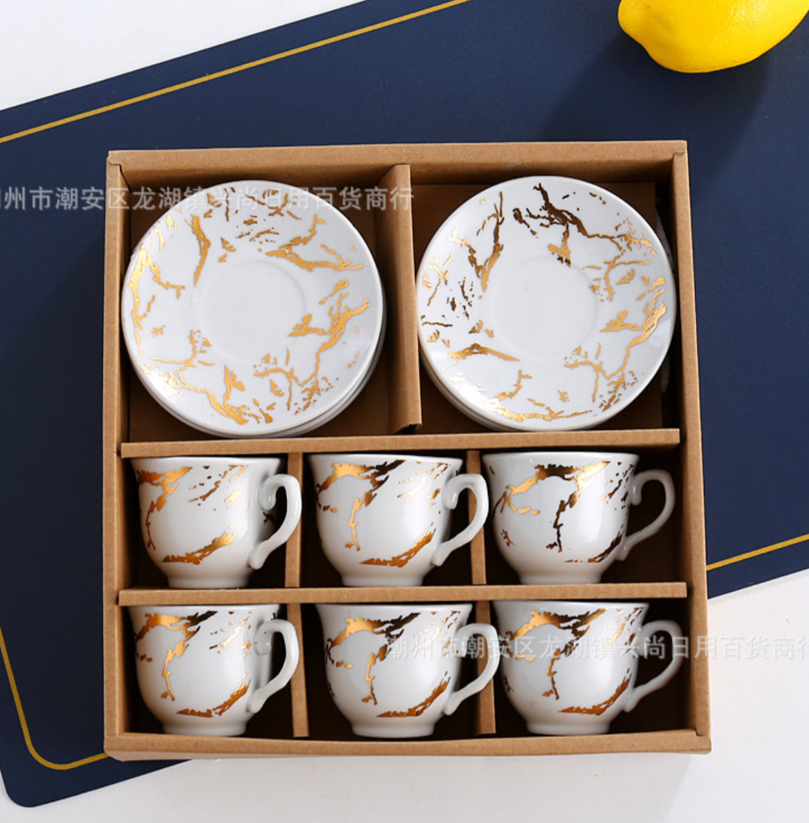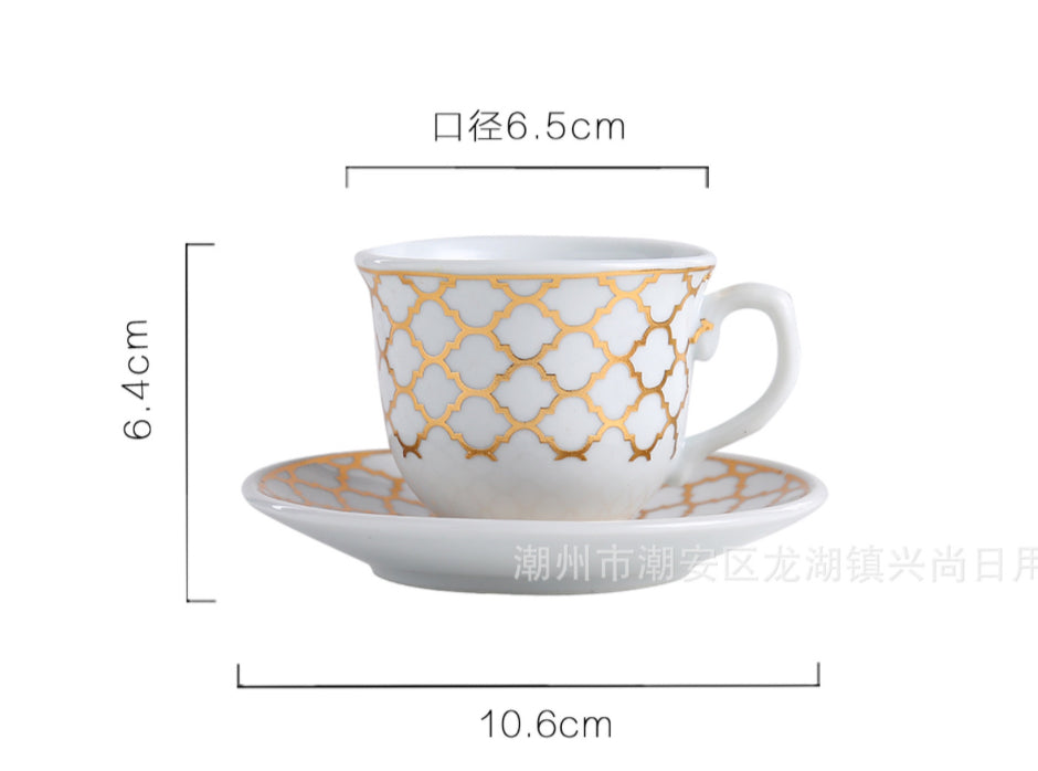 Set me filxhana kafeje me dizenjo mermeri gold; 6 copë; Material; Qeramike; Paketim: 23 cm x 24 cm; Përmasat si në foto: