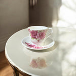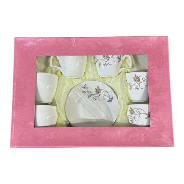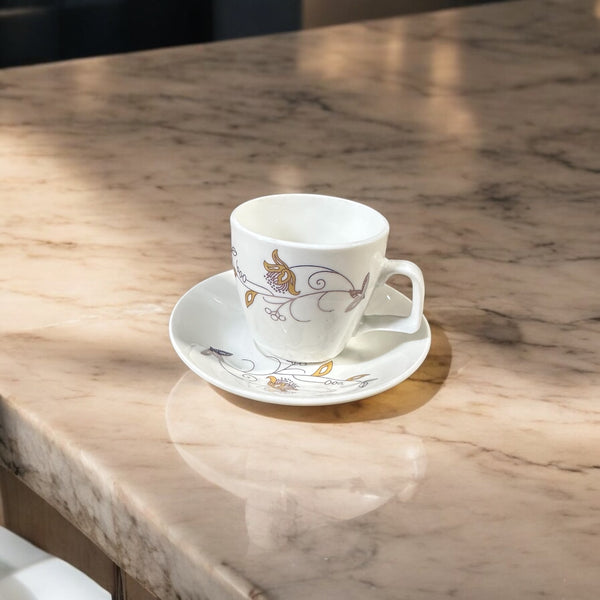 Set me filxhana kafeje me lule të verdha; 6 copë; Materiali: Qeramike; Përmasa: Gjatësi filxhani 6cm, pjatë 11 cm