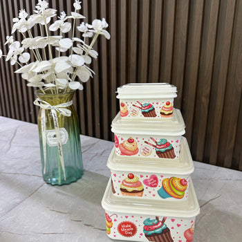 Set enë ruajtëse ushqimi me kapak, 4 madhësi, dizajn embëlsirash