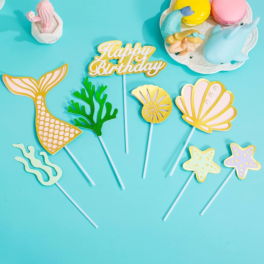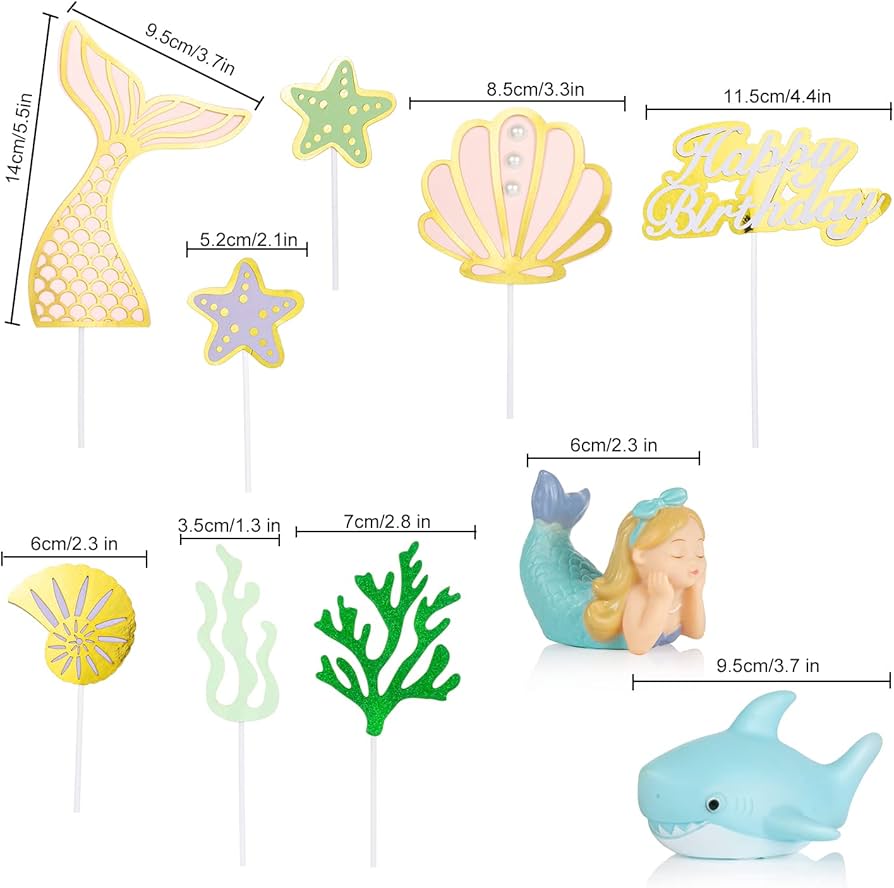 Cake topper me sirenë dhe figura detare, set me 7 copë; Përmasa nga 14 cm më e madhja deri në 3.5 cm më e vogla