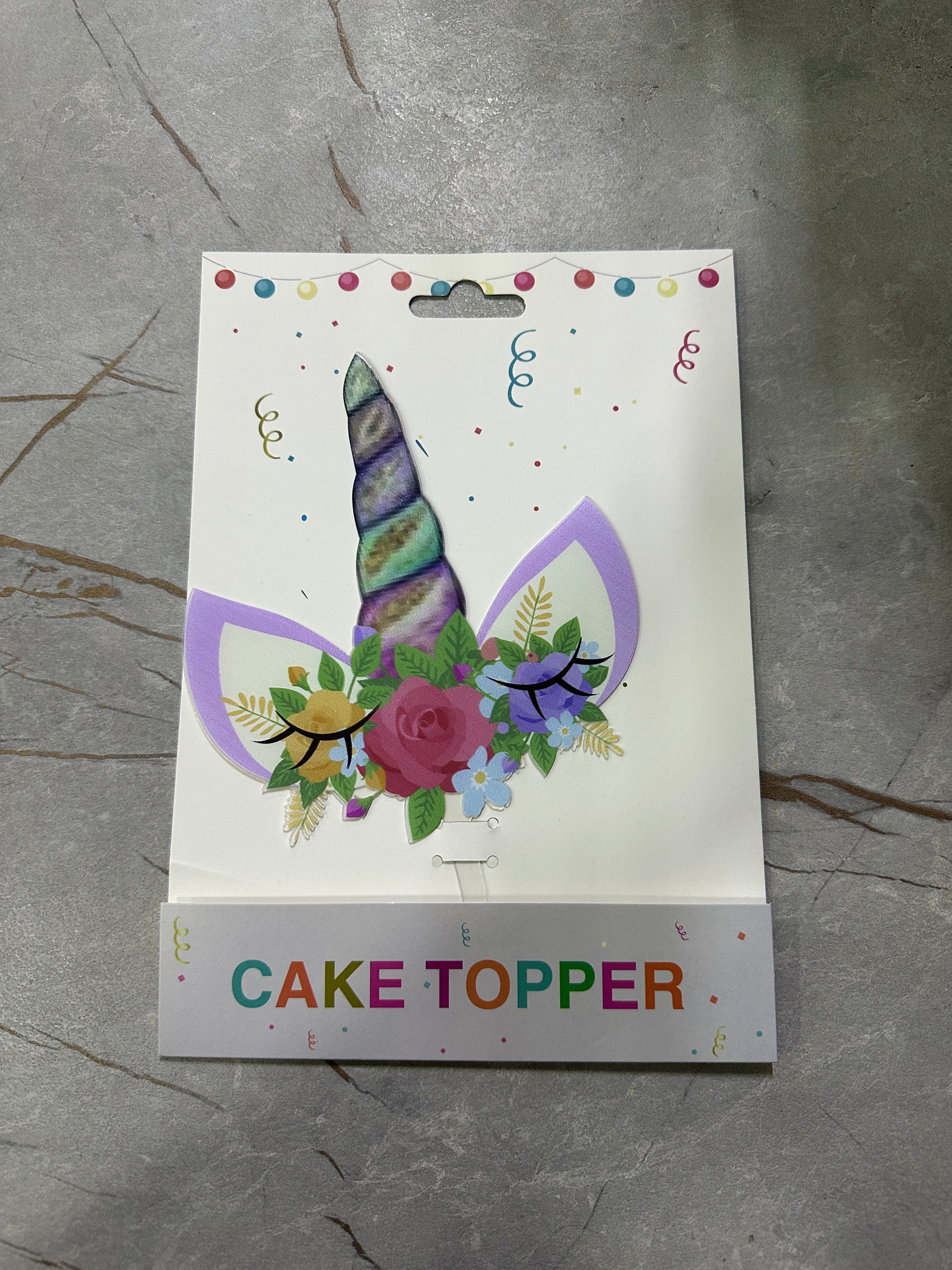 Cake topper njëbrirësh me lule, ideal për zbukurimin e tortave të ditëlindjes për fëmijë.