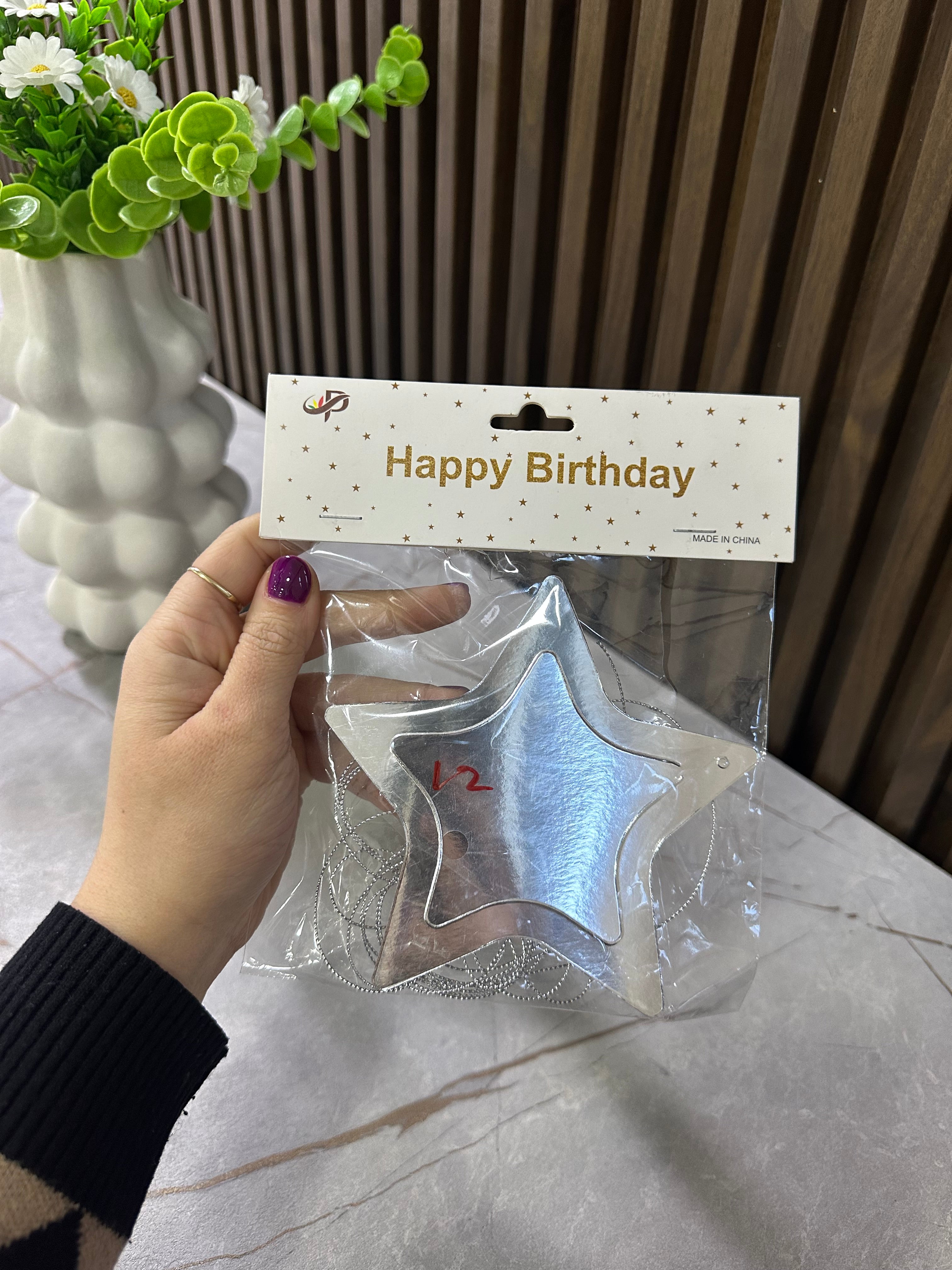 Dekor “Happy Birthday” në formë ylli argjendi, i përshtatshëm për zbukurimin e ditëlindjeve dhe festave.