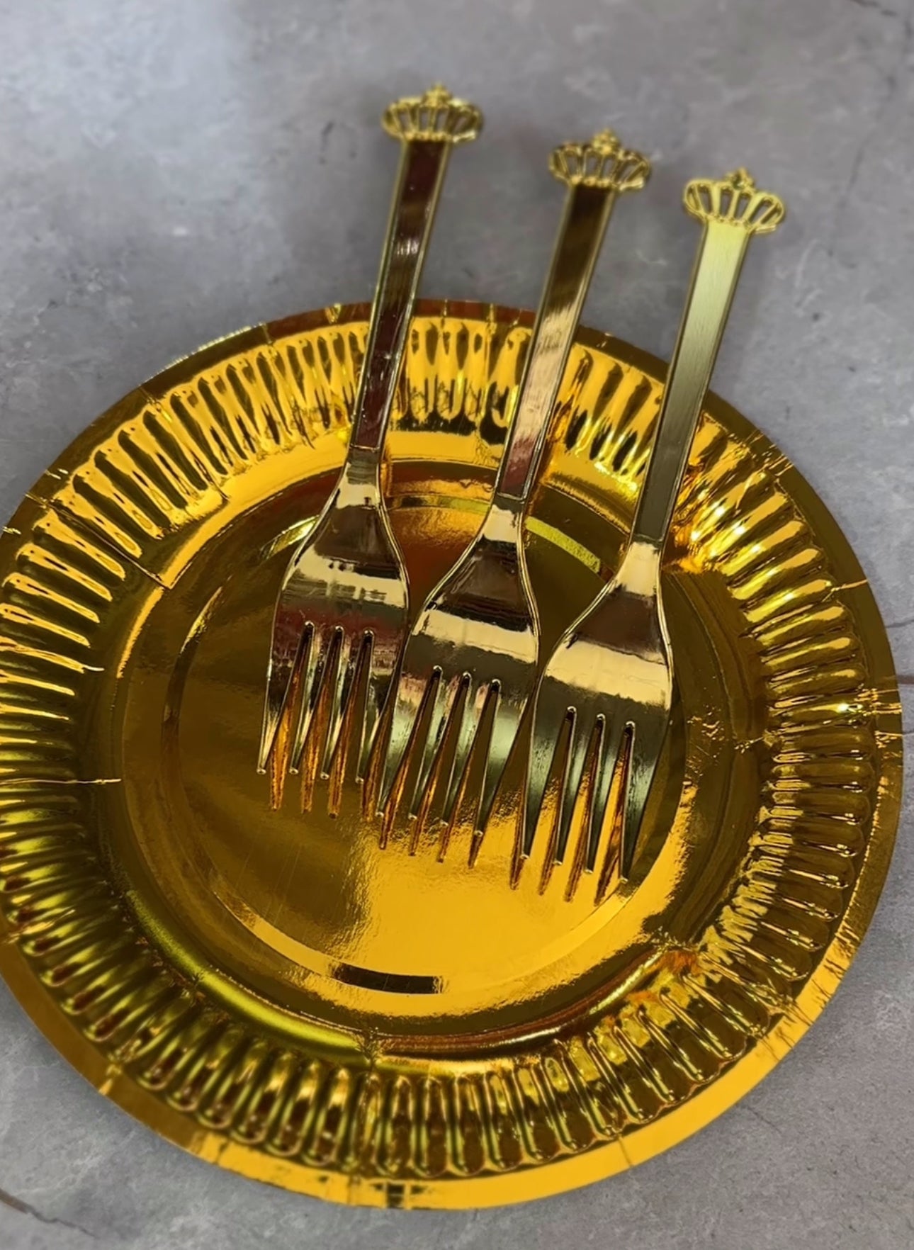 Pirunj plastik me kurorë për ditëlindje; Ngjyra: Gold, silver; Pako 6 copë 1385-26 (gold) / 1385-27 (silver)