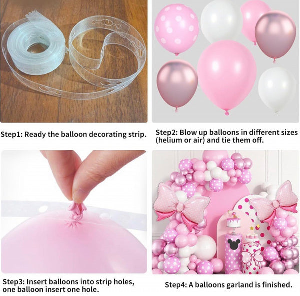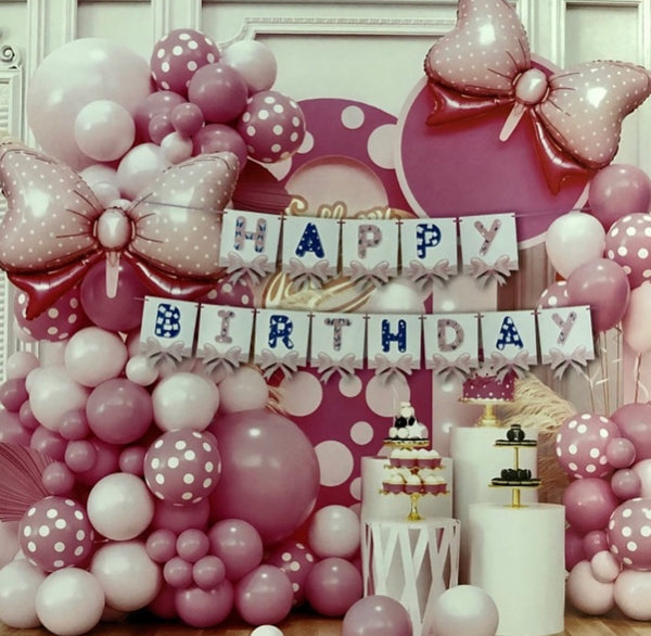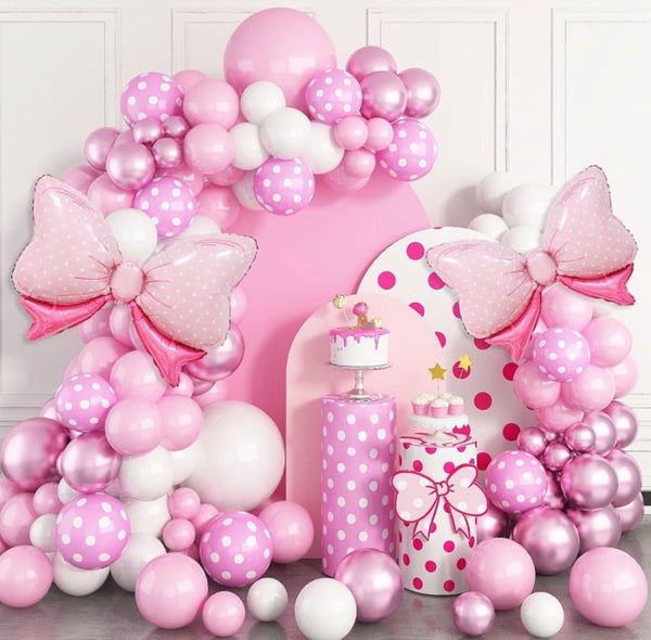 Set me 102 elementë me fjongo e pika që përmban tullumbace me pika, tullumbace rozë e pastel, 2 tullumbace në formë fjongo 31 inch, 1 baner me shkrim "Happy Birthday",...
