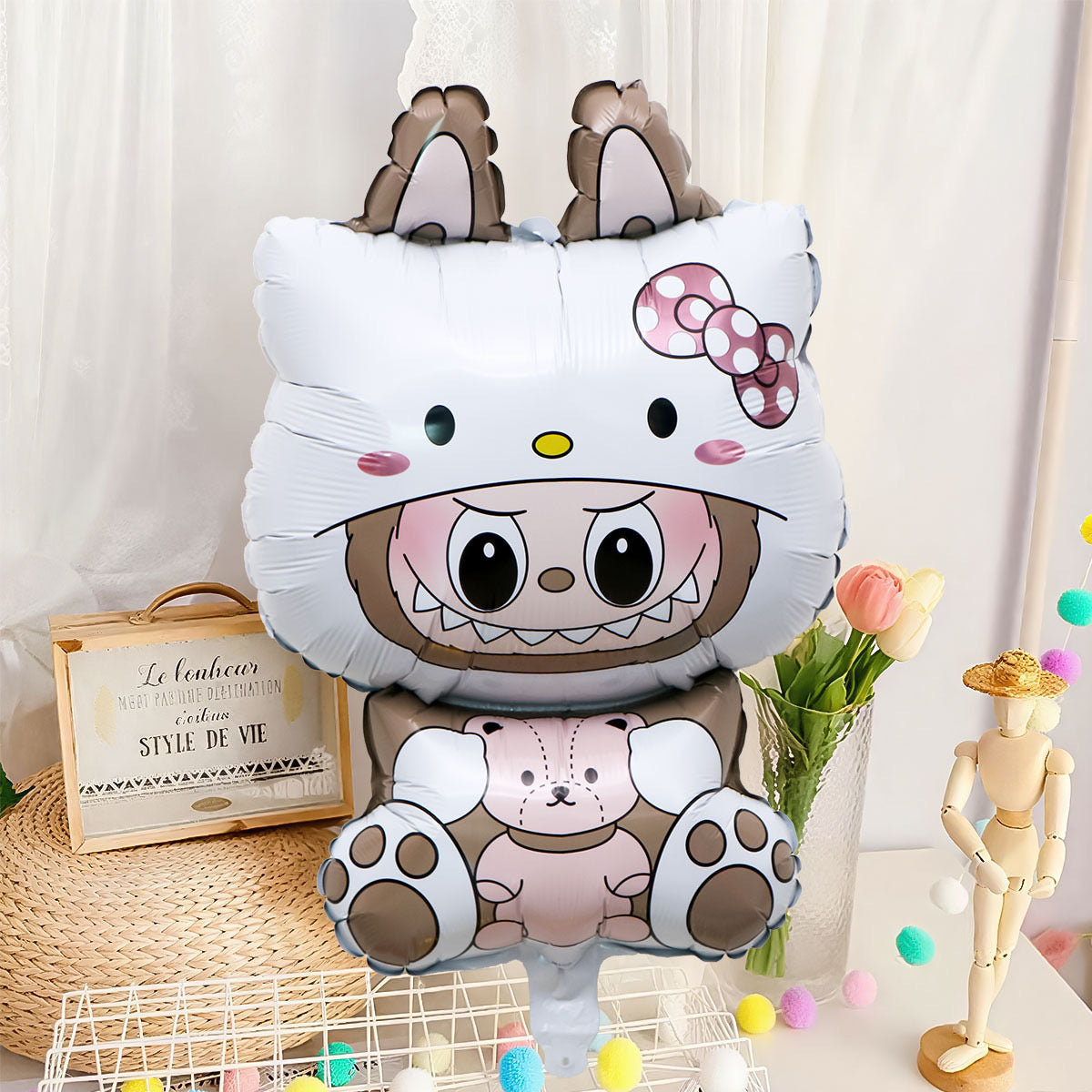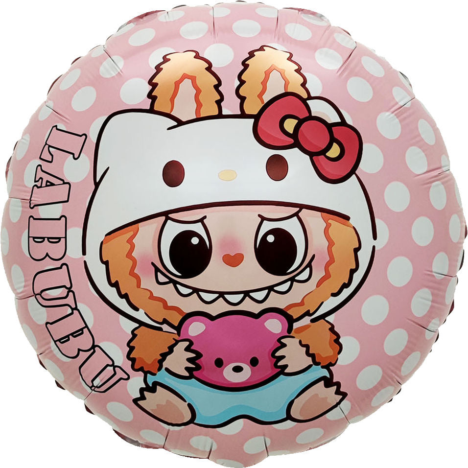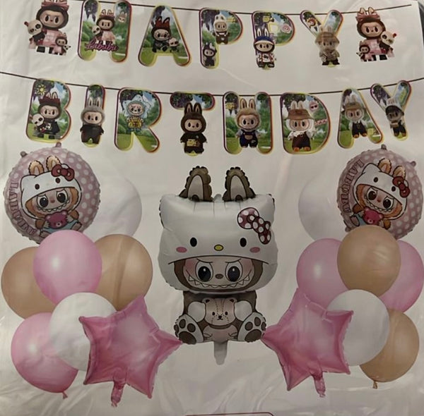 Set me 18 pjesë me Labubu me veshje Hello Kity për dekor ;Seti përmban: Baner "Happy Birthday", tullumbace foil me Labubu me veshje Hello Kitty dhe dy tullumbace foil me figurë, gjithashtu edhe 4 tullumbace të bardha, 4 rozë e 4 bezhë