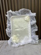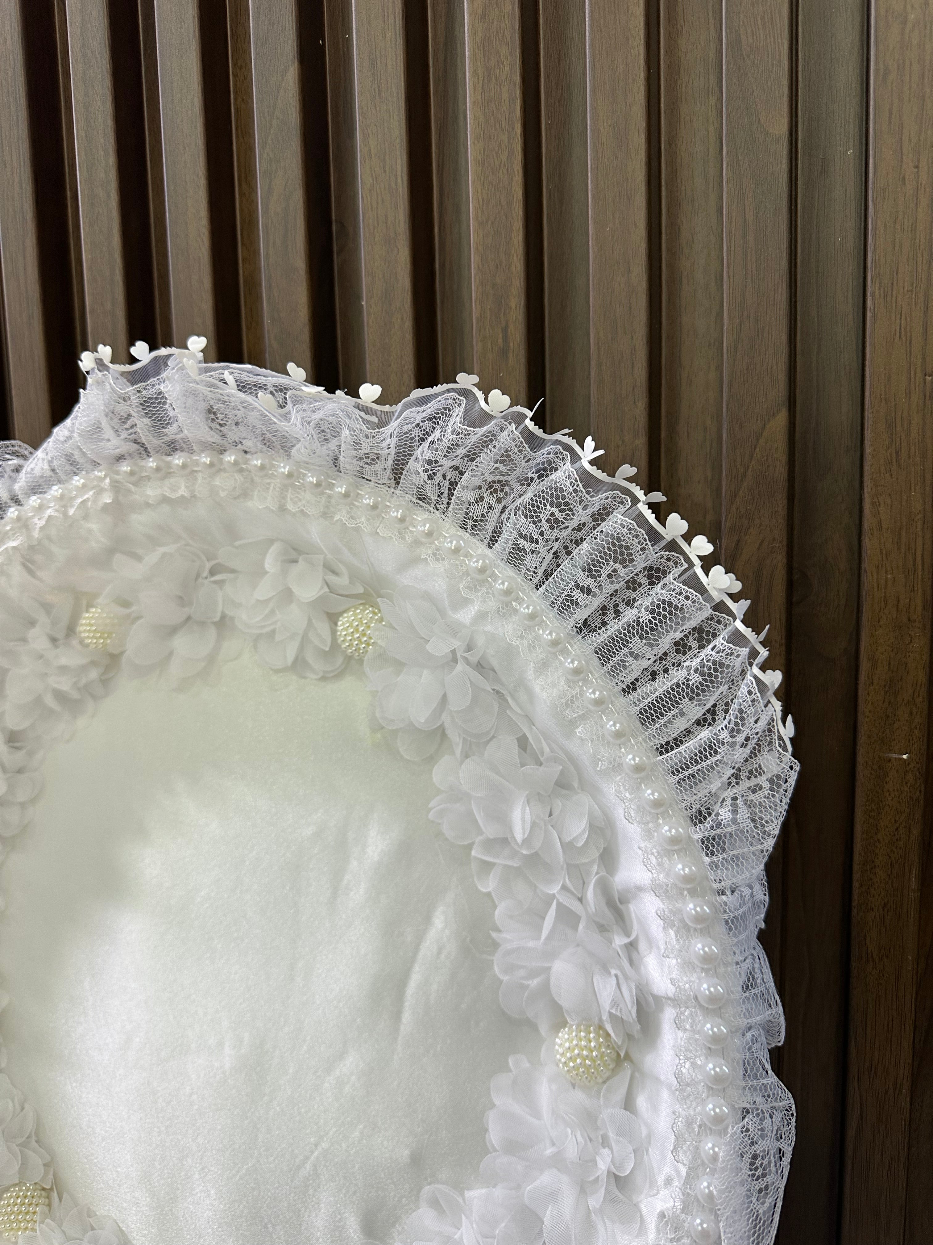 Tabaka dekorative e bardhë, e zbukuruar me dantellë dhe lule, e përshtatshme për ceremoni dhe dekor tavoline.