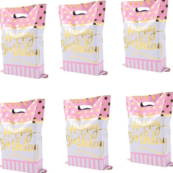 Qese për ditëlindje me shkrim “Happy Birthday” me pika gold dhe vija rozë
