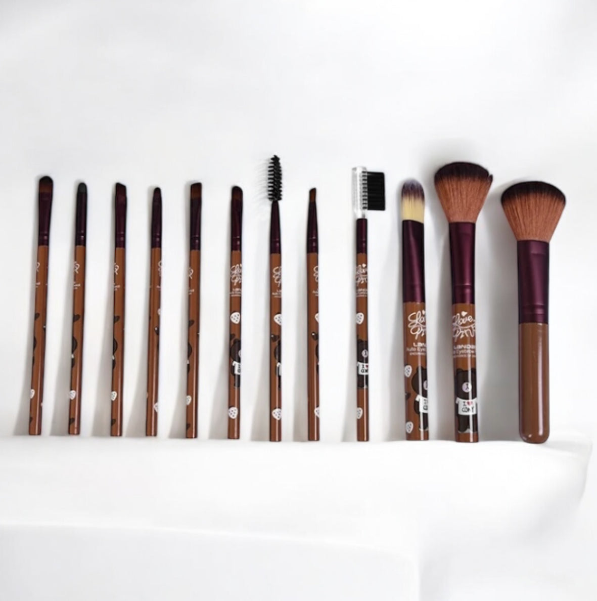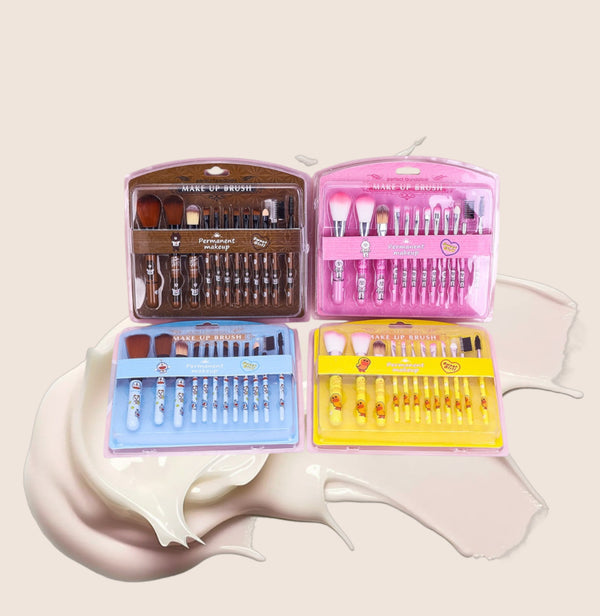 Set me 12 furça me figura të ndryshme si: rosak, lepur, arush; Seti përmban: furçën e pudrës, furçën e blush-it; një furçe për penel; dy për sytë; një për të përhapur fondatinën; një për korrektorin; një për vetullat; dhe furça për qerpikët dhe konturin