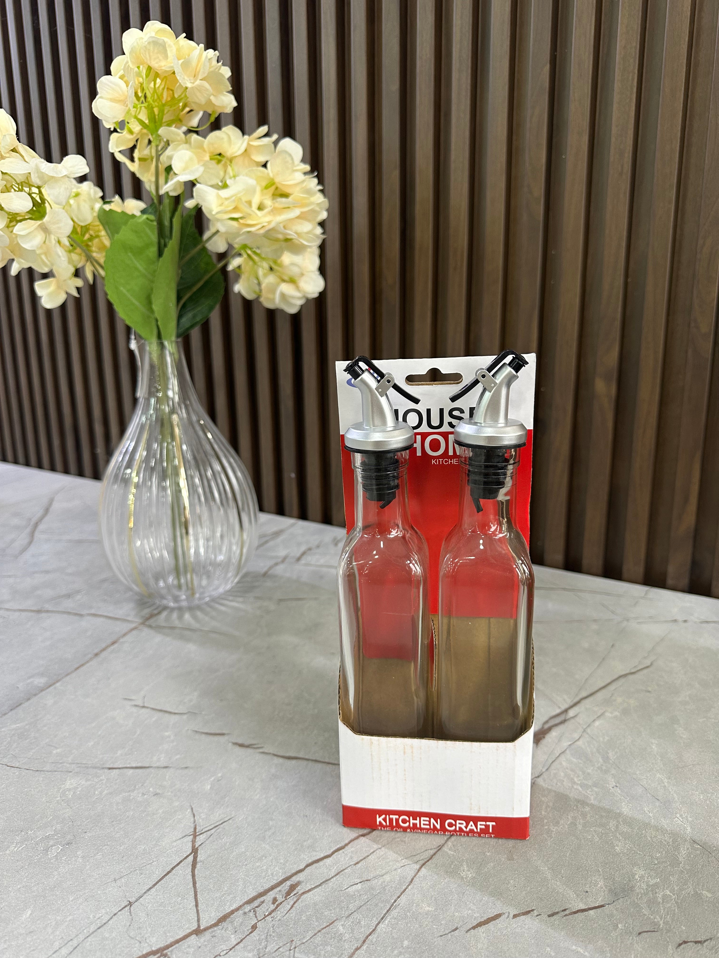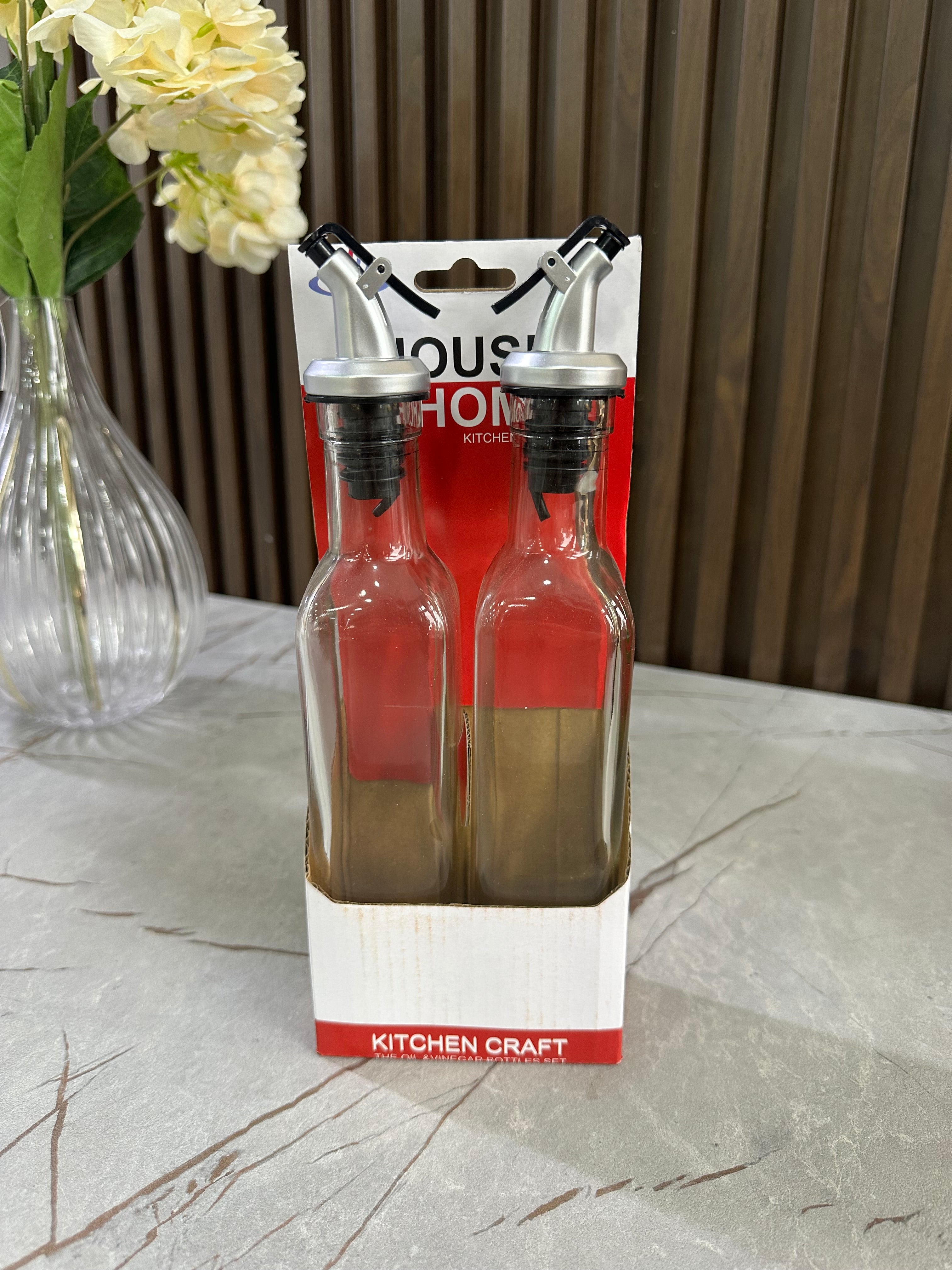 Set shishesh qelqi me dozues për vaj dhe uthull, që sigurojnë hedhje të kontrolluar dhe organizim të pastër e praktik në kuzhinë.