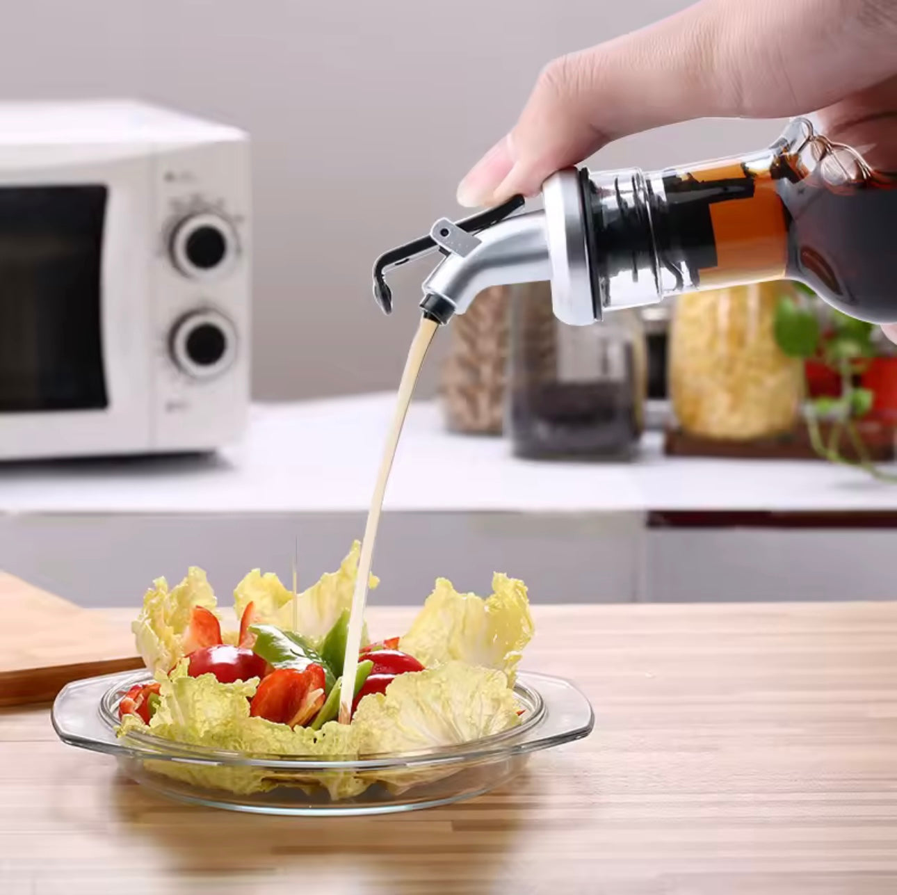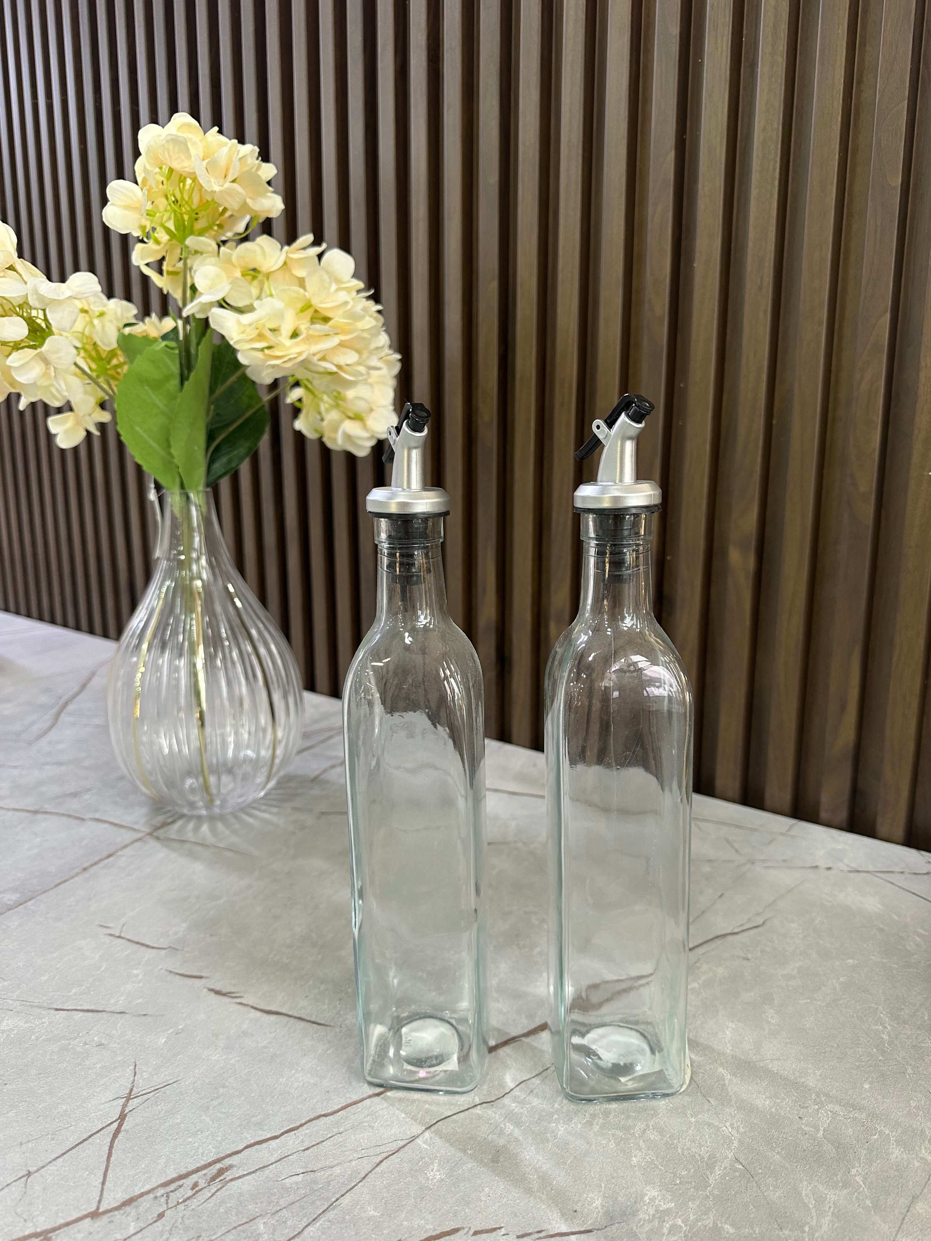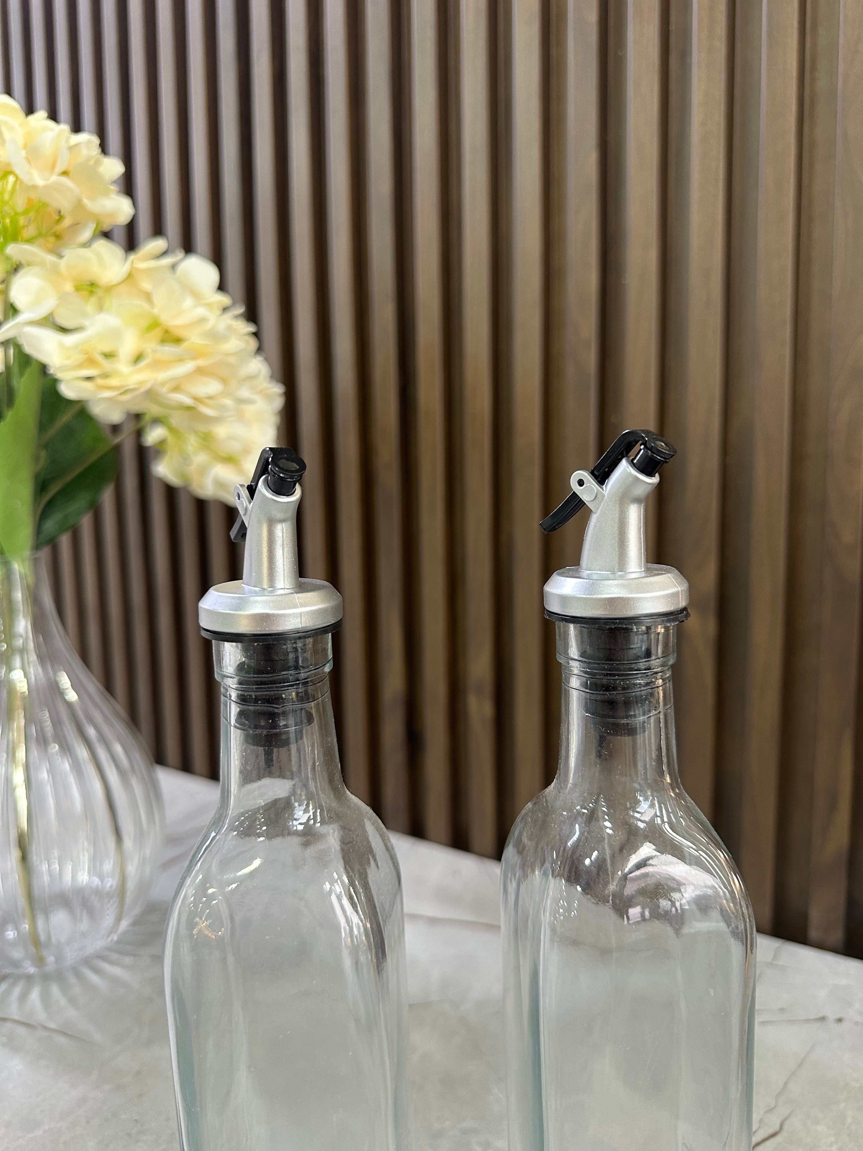 Shishe qelqi me grykë dozimi për vaj dhe uthull, që lehtëson hedhjen e kontrolluar dhe ruan pastërtinë gjatë gatimit.