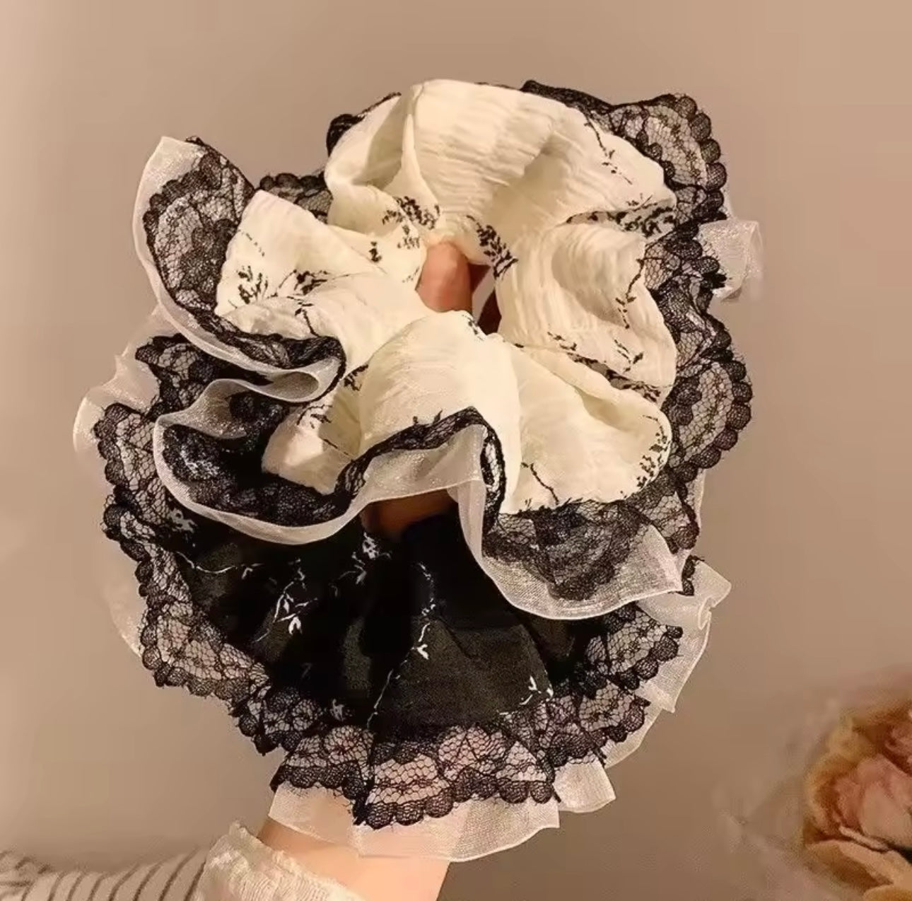 Scrunchie flokësh me dantellë dhe dizajn lulesh në ngjyra bardh e zi. I thjeshtë dhe i përshtatshëm për çdo stil.