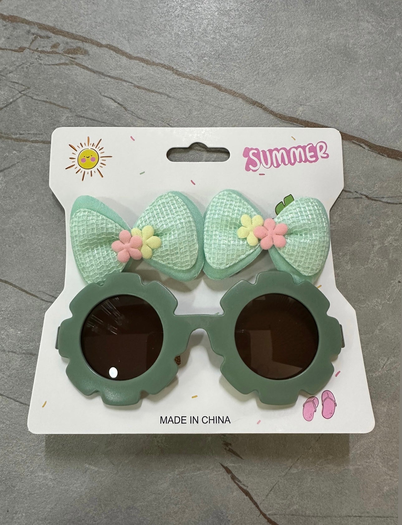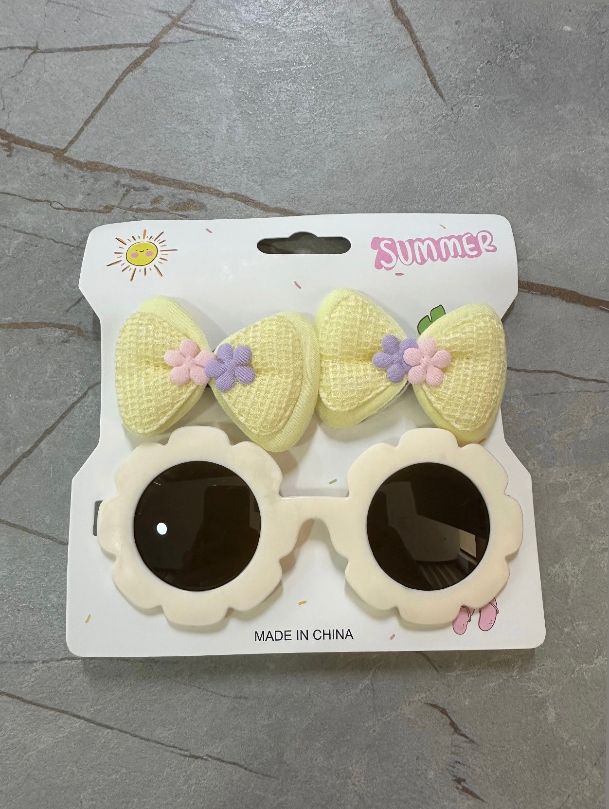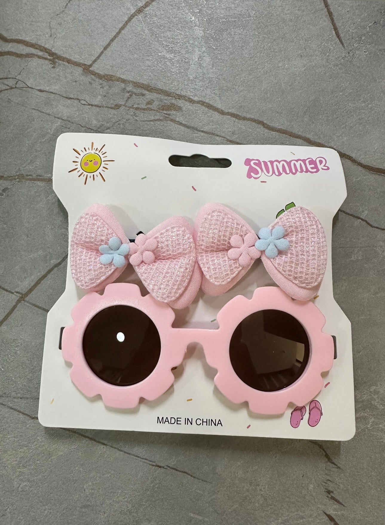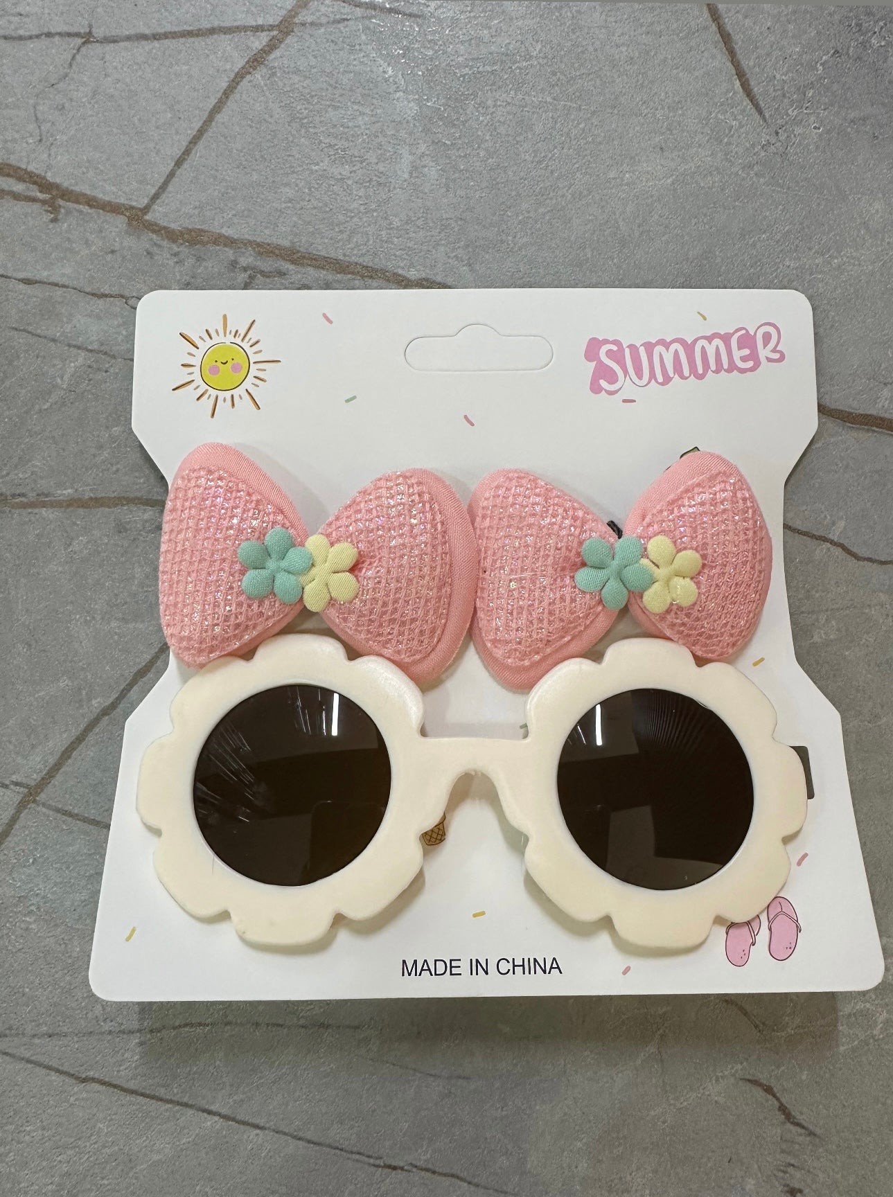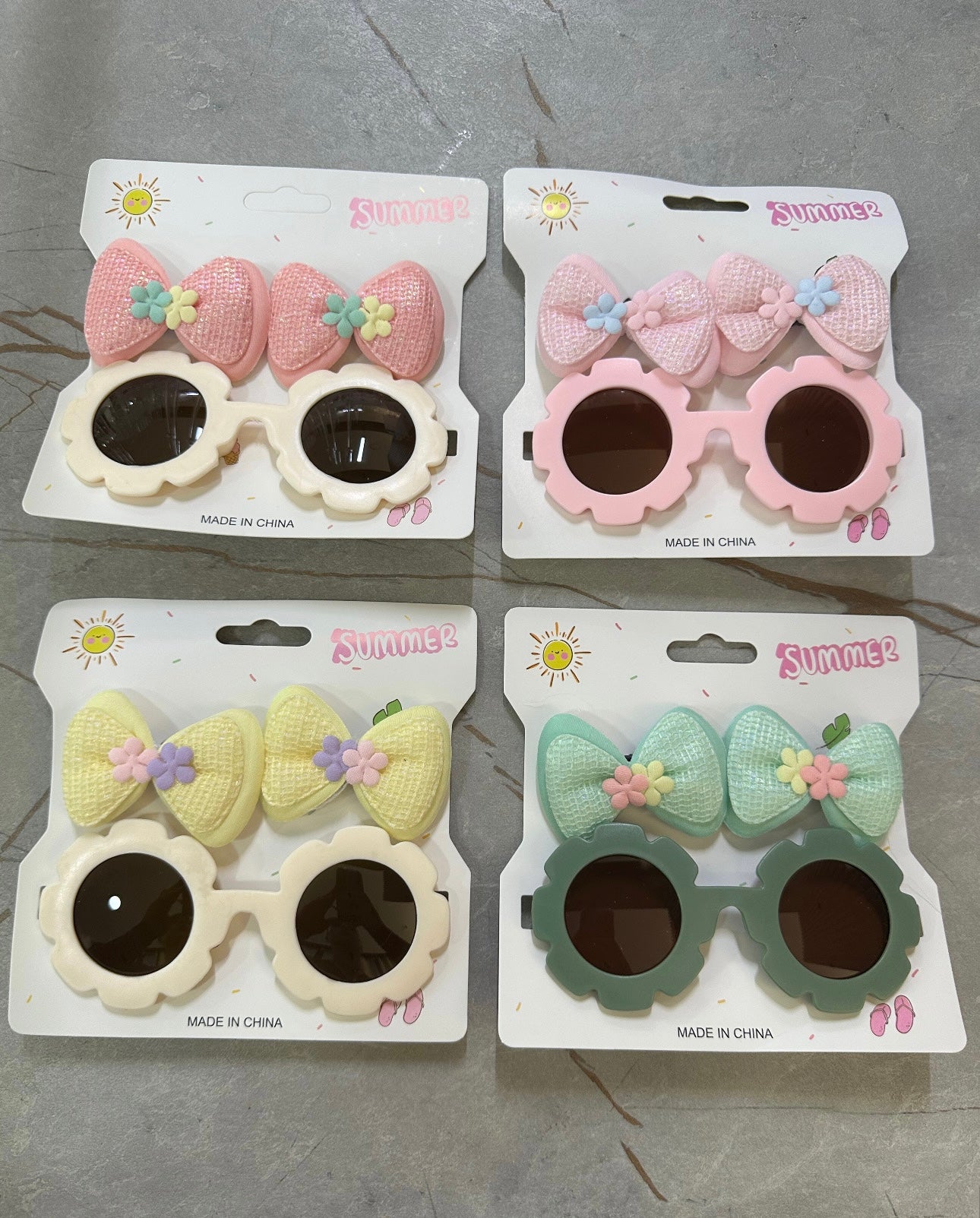 Set veror për vajza me syze dielli dhe fjongo të dekoruara me lule – dizajn i ëmbël dhe plot ngjyra për ditët me diell.