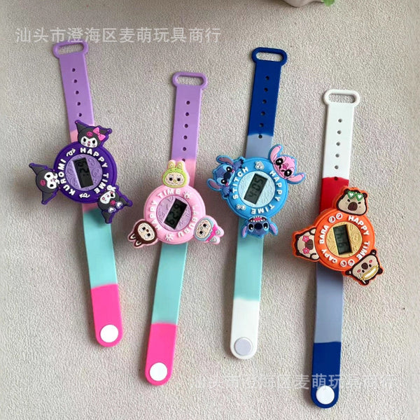 Orë me ekran dixhital për fëmijë me shkrim "Happy Time" me Labubu ose Stitch