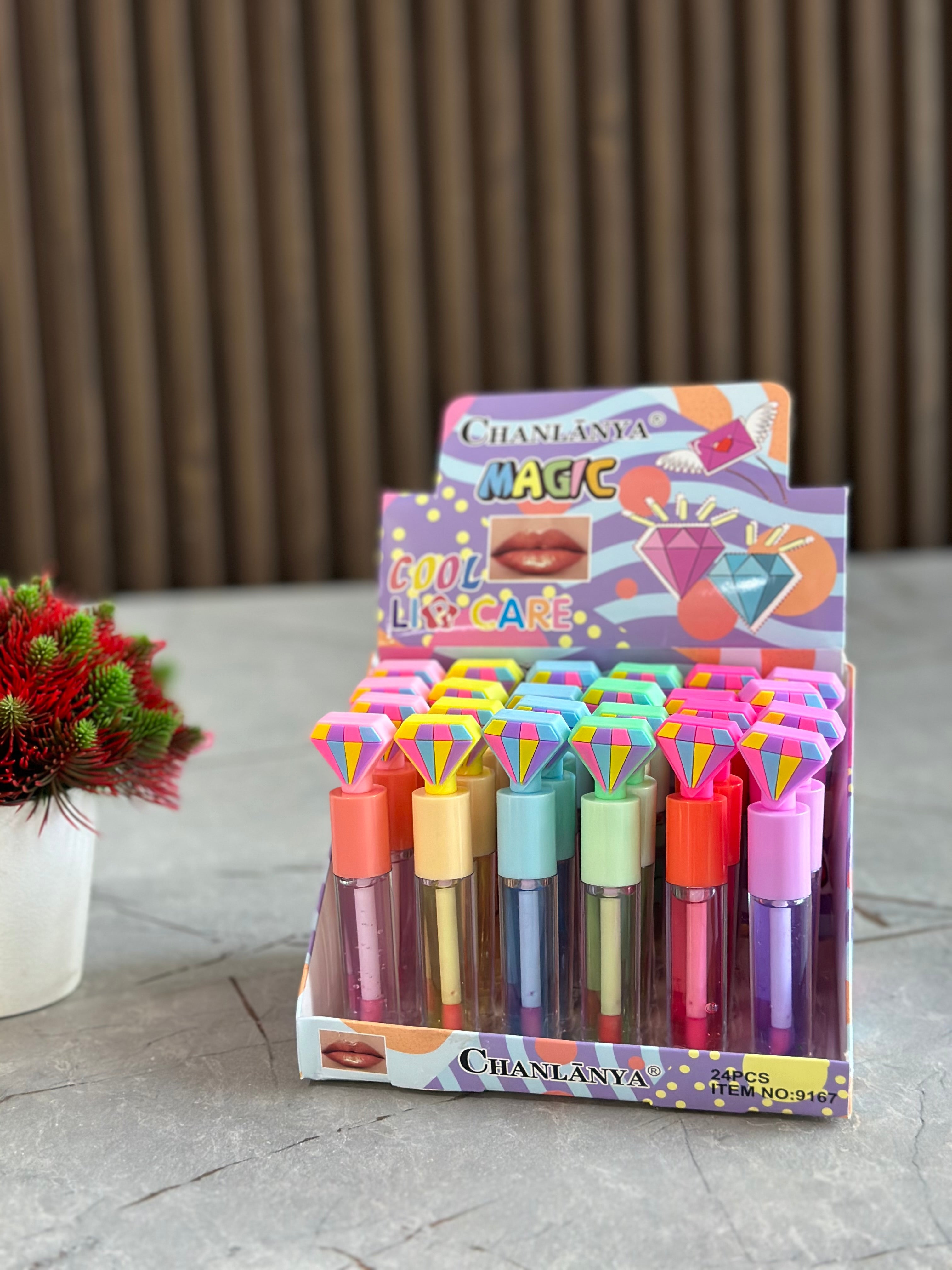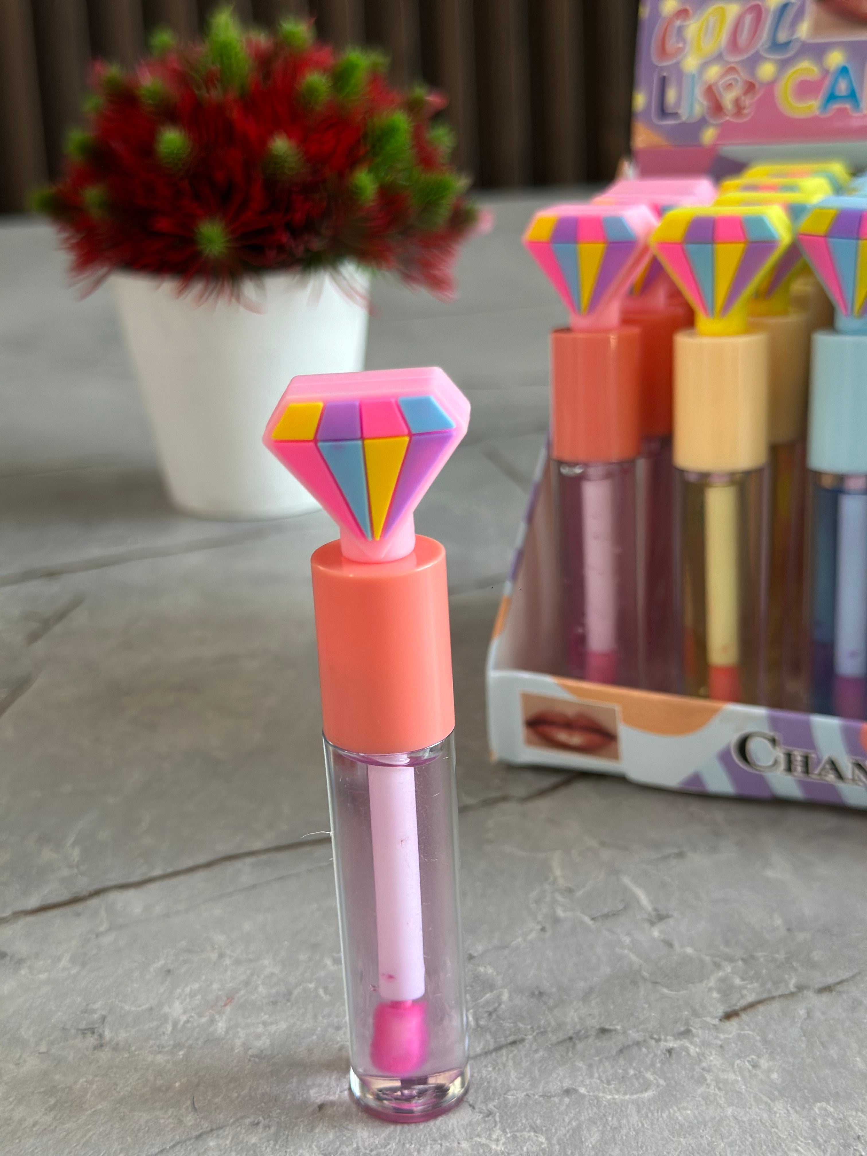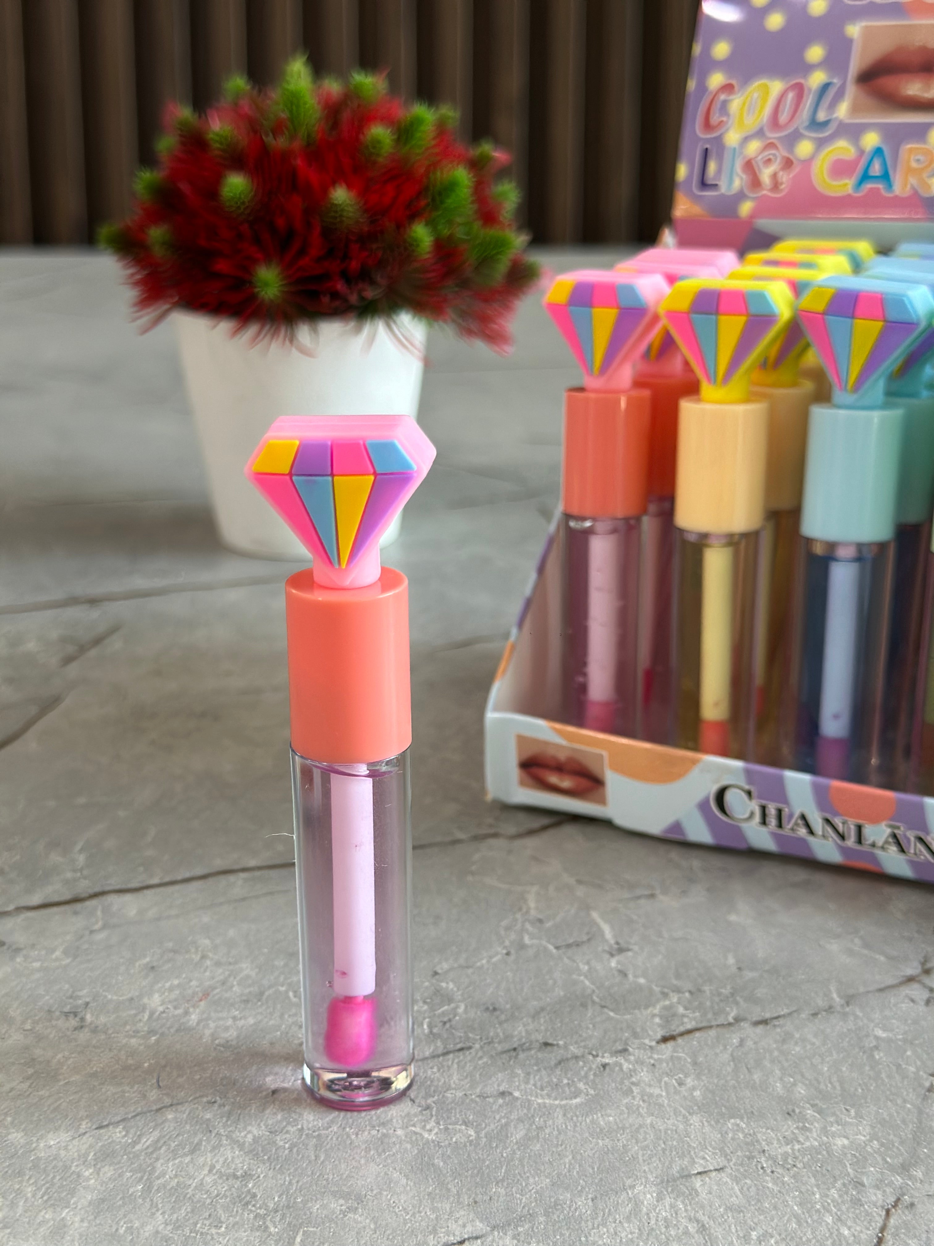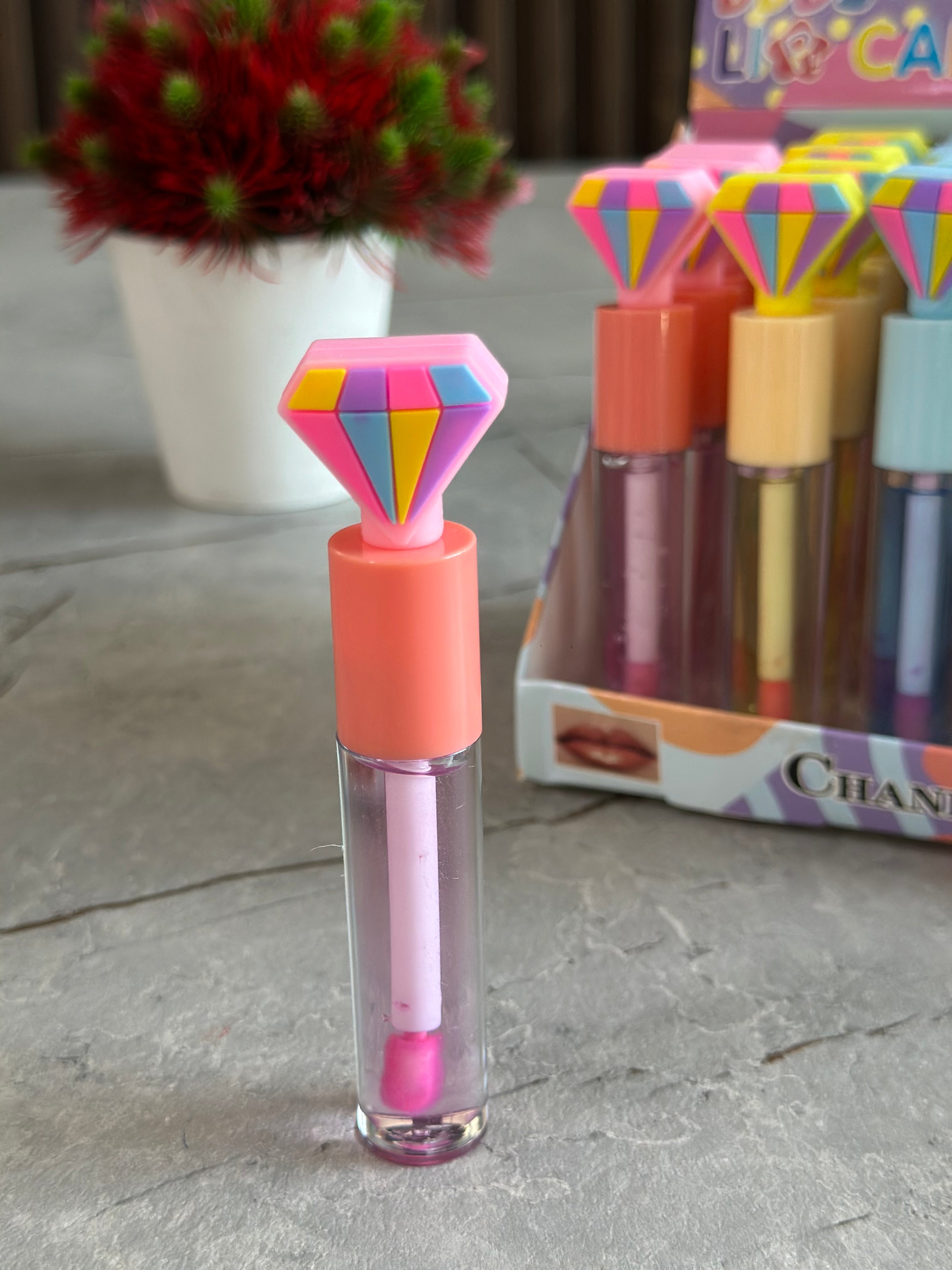 Lip gloss me kapak si çadër nga Romantic Rain me 6 nuanca të ndryshme; Pako me 24 copë