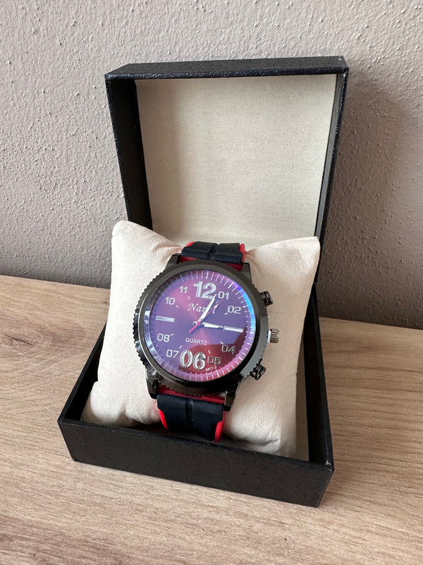 Orë sportive për meshkuj me rrip silikoni kuq e zi dhe fushë vishnje